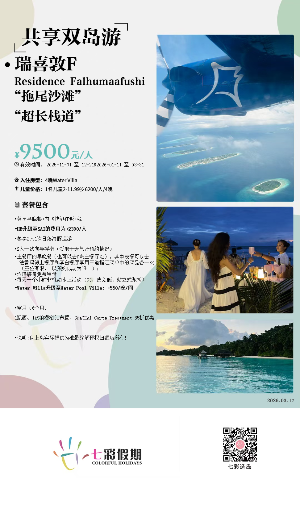 活动简介:度假村与同集团的瑞喜敦迪鼓拉岛以栈桥相连,这把两个岛组成了马尔代夫最大的岛屿度假圣地之一,穿过这座栈桥,就能轻松实现双岛游。