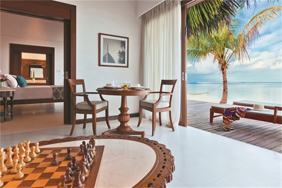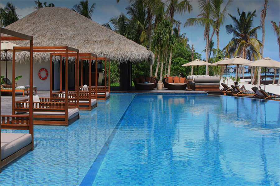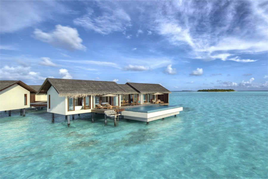 房型介绍:全岛4栋的水上泳池别墅面积为182㎡,标配私人泳池。藏匿在度假村最私密的地点之一,沉醉在豪华水上泳池别墅内的奢华空间内,感受壮观,激活您所有的感观。在超大客厅内卸下所有压力和负担,感受放松的愉悦,让自己沉浸在绝对的舒适中,慵懒地窝在沙发里看看书,或欣赏迷人的风景。