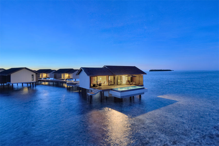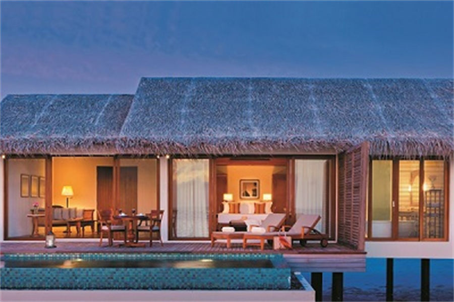 房型介绍:全岛4栋的双卧水上泳池别墅面积为282㎡,标配42.5㎡的超大私人泳池。让自己沉浸在马尔代夫的美丽之中,沉醉在水上别墅的广阔空间内。跨出私人露台,在私人游泳池放松身心,或在海洋与日落交相辉映的美景中用餐。这个愉悦的天堂适合夫妻也适合家庭带着年长的孩子一起来休憩。别墅另有一个卧房带有双床。