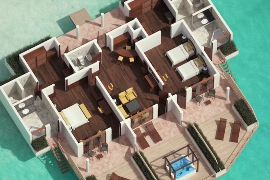 房型介绍:这些水上别墅位于码头的尽头,可欣赏岛上最美的景色。私人户外漩涡浴缸、宽敞的日光浴平台和两间卧室共同营造出一个僻静的休憩场所,让您感觉远离尘嚣。