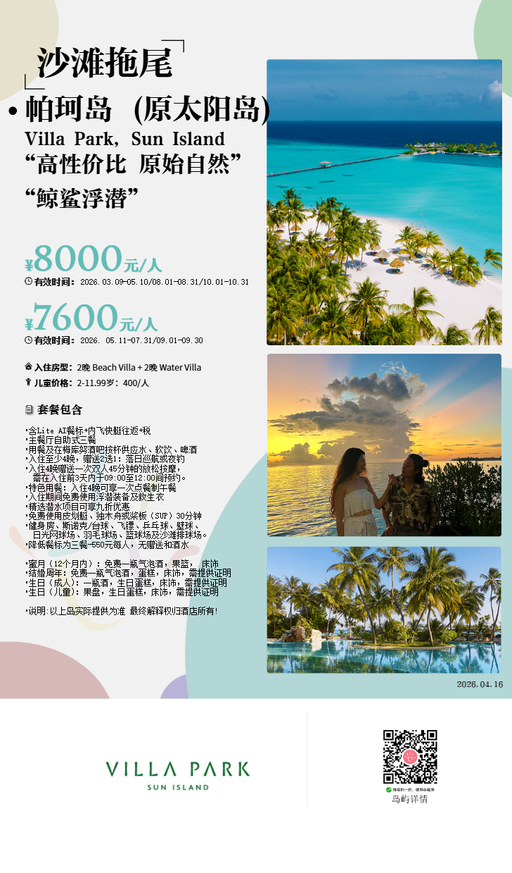 马尔代夫维拉公园太阳岛Villa Park Sun Island Resort,坐落在阿里南环礁,以其优美的环境,吸引了许多旅客前来度假,太阳岛度假村为您提供的是您所想不到的最现代化的舒适便利的设施。岛屿长为1.6公里,宽为500米的那拉古爱度岛上,是马尔代夫最大的度假村之一,这里的房间很大,还有不错的室内/室外卫生间、坐浴盆和小吧台。虽不算新潮,但依然吸引的不少懂得欣赏马尔代夫的美的游客。这里的潜水学校是一所大型机构,提供价格合理的服务。在主防波堤尽头的房礁可以进行浮潜。礁湖的其他地方很宽阔,很适合游泳和水上运动。