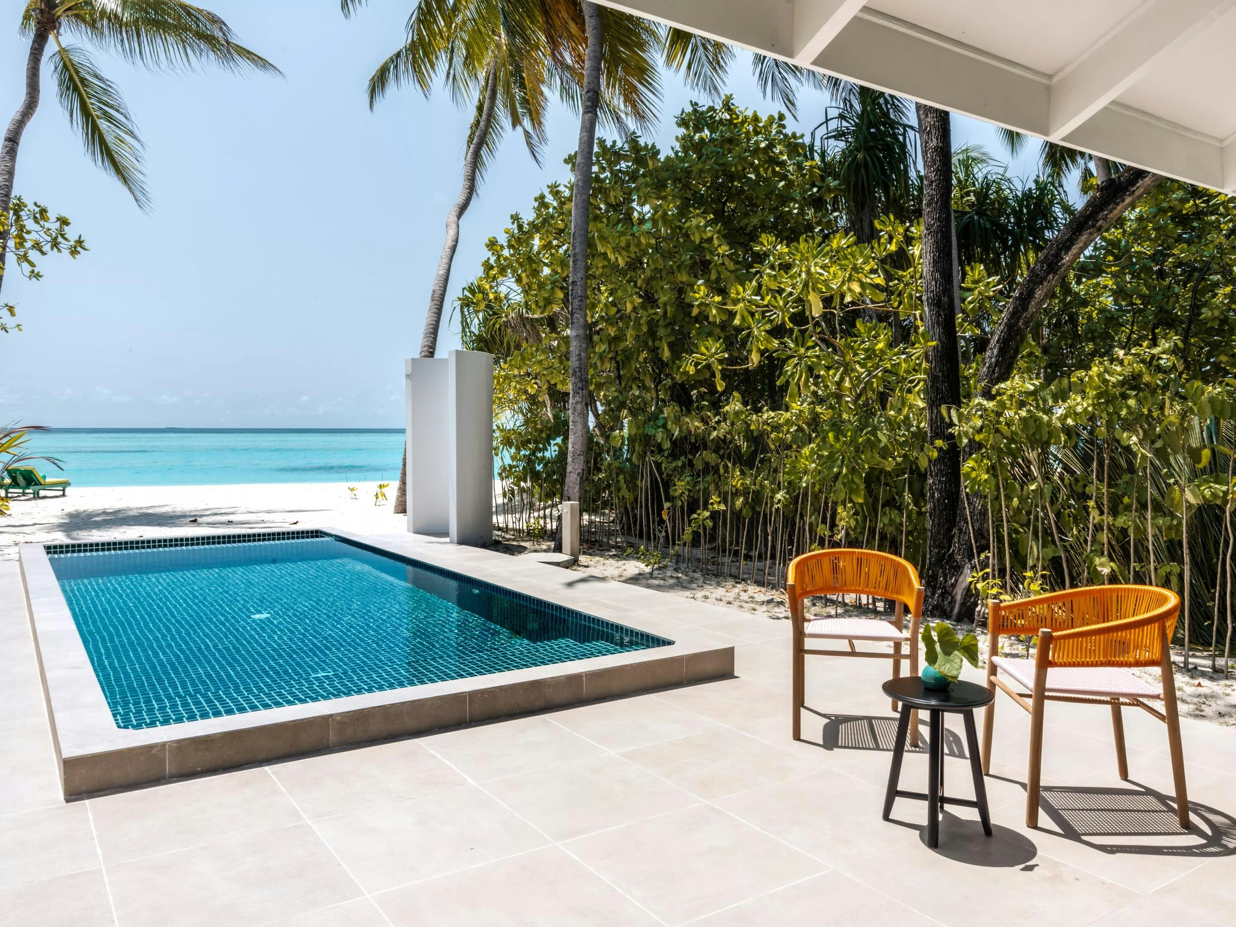 房型介绍:两栋宽敞的独立别墅相互连接,提供豪华的室内外生活,通向私人阳台、游泳池、露天淋浴和日光浴平台。现代海滨别墅的感觉与纯正的马尔代夫魅力完美融合。在热带岛屿微风的清凉下,在私人泳池中放松身心,或者探索家门口的原始白色海滩和碧绿海水。