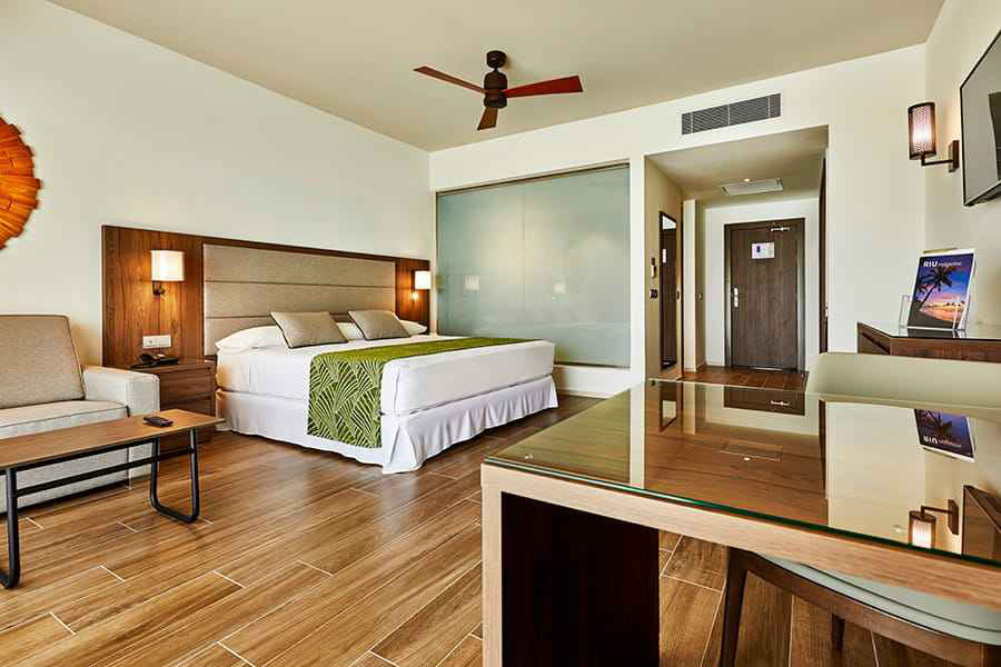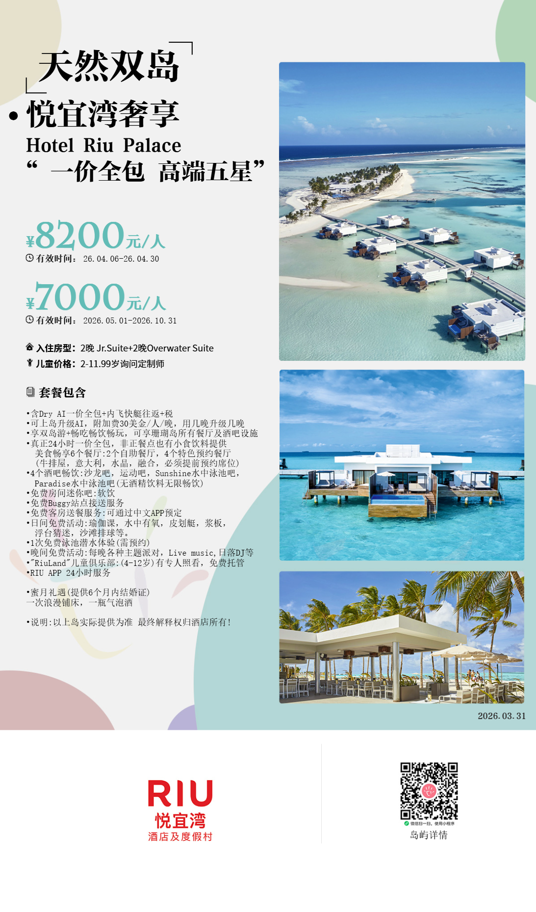 房型介绍:这些位于水边的独家客房保证您度过一个难忘的假期。Hotel Riu Palace Maldivas酒店的这些47平方米的套房配有一张特大号床(200x200厘米)或两张小双人床(125x200厘米)、带沙发的休息区、卫星电视、空调、吊扇、饮料分配器、迷你吧和水壶。此外,露台上设有浴缸、巴厘岛床、日光躺椅,并可直接通往大海。