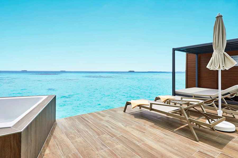 房型介绍:这些套房位于水上,设有私人游泳池,专为希望在每一个细节上体验奢华住宿的客人而设计。马尔代夫悦宜湾皇宫酒店的这些60平方米的套房配有一张特大号床(200x200厘米)或两张小双人床(125x200厘米)、沙发、更衣区、卫星电视、空调、吊扇、饮料分配器、迷你吧和水壶。如果这还不够,您还可以在可直接通往大海的露台上享受小型私人游泳池、巴厘岛床和日光躺椅。