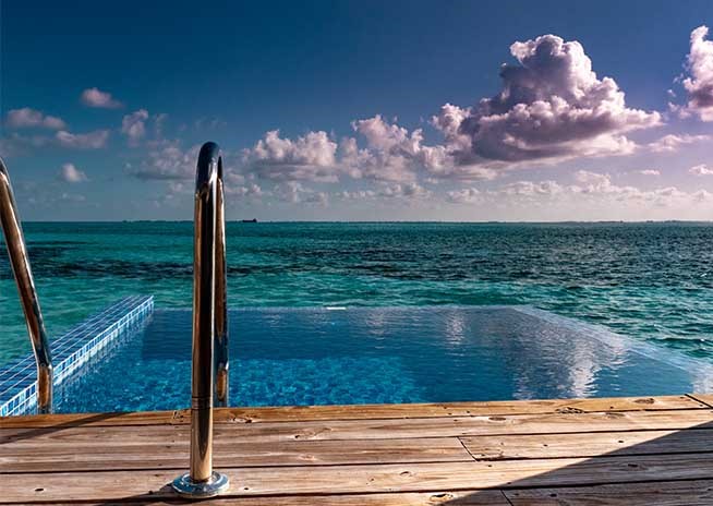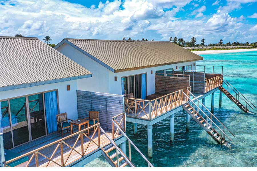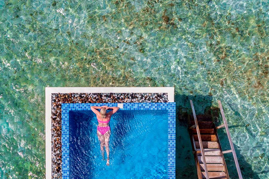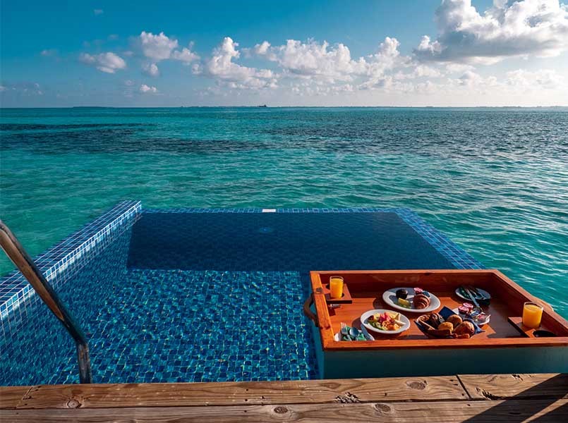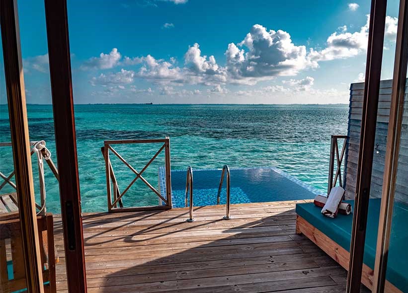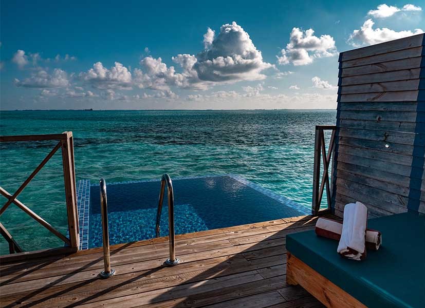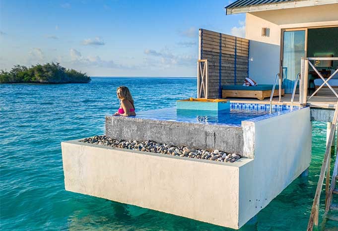 房型介绍:75㎡超大空间的水上别墅,拥有私人泳池,不用去公共泳池挤,整座岛屿只有两间,每天伴随着柔和的海浪声入睡,再从日出的一缕晨光中醒来,,可以再甲板上休息,观看海洋生物等等,也可以一头扎进Tiffany蓝的泻湖中。