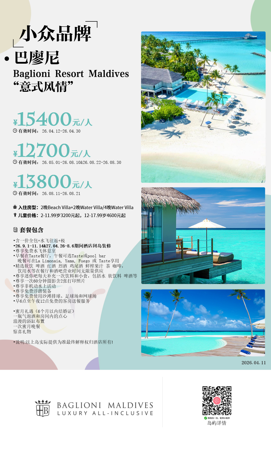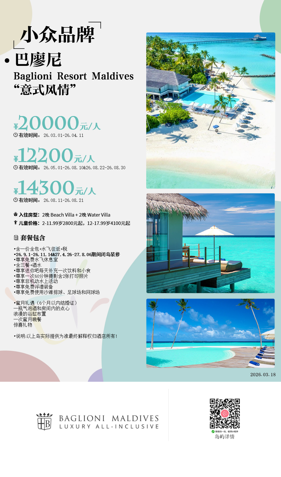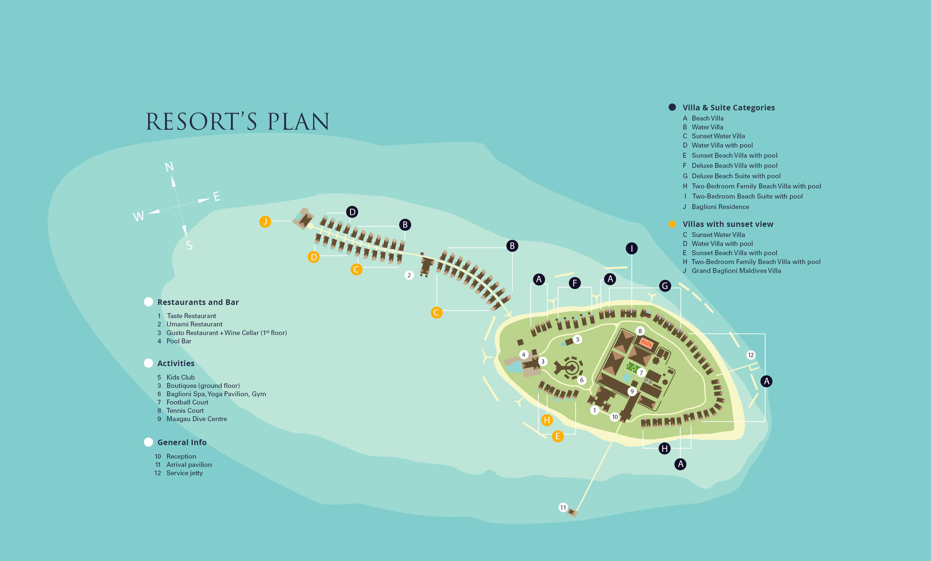 隶属于巴廖尼酒店集团(Baglioni Hotels),2019年开业,设施比较新,和马累机场的距离适中,水飞40分钟上岛,位于达鲁阿环礁的Maagau岛,来自意大利独资的集团,整座岛屿充满了意大利风情,意大利的美食绝对让你感到垂涎欲滴,酒店一直提倡意大利风格和当地特色做创新,酒店提供了非常舒适的住宿,还有各种运动,在玩累之后还有意大利风格与巴廖尼水疗中心相结合的spa馆来给肉体上的放松,除此酒店还拥有瑜伽馆给你心灵上的放松,两个层面的放松,岛屿是马代顶级的豪华酒店之一,整座酒店生机盎然,绝对是难忘的体验。