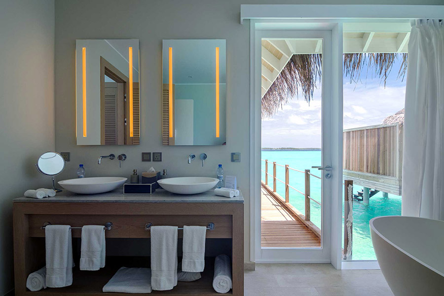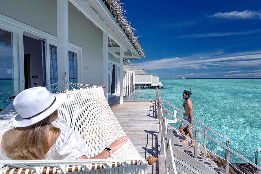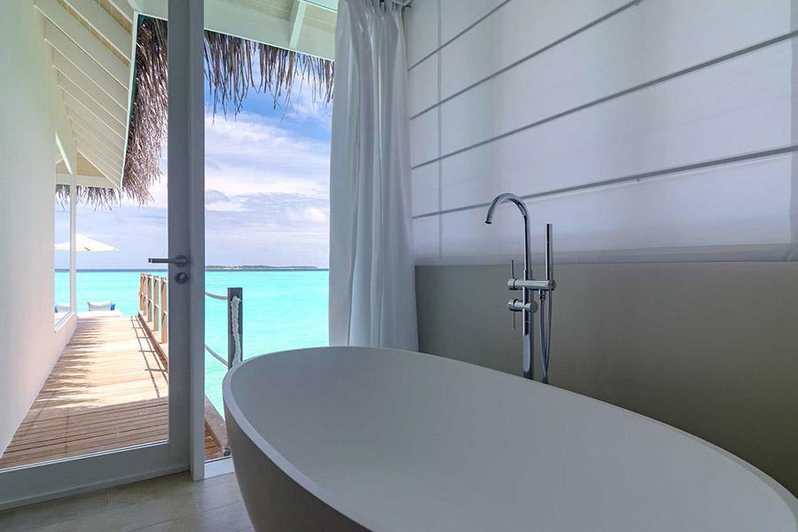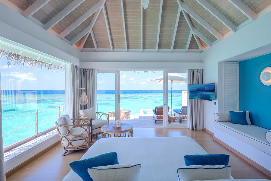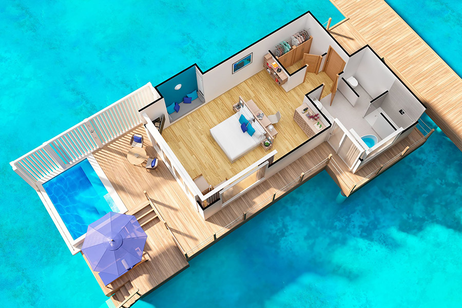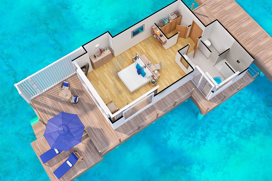 房型介绍:105㎡超大面积的别墅,17 栋高跷别墅位于度假村泻湖上方,通过凸起的木制人行道与岛屿相连。我们的水上别墅是眺望晶莹剔透的海水的理想之选。