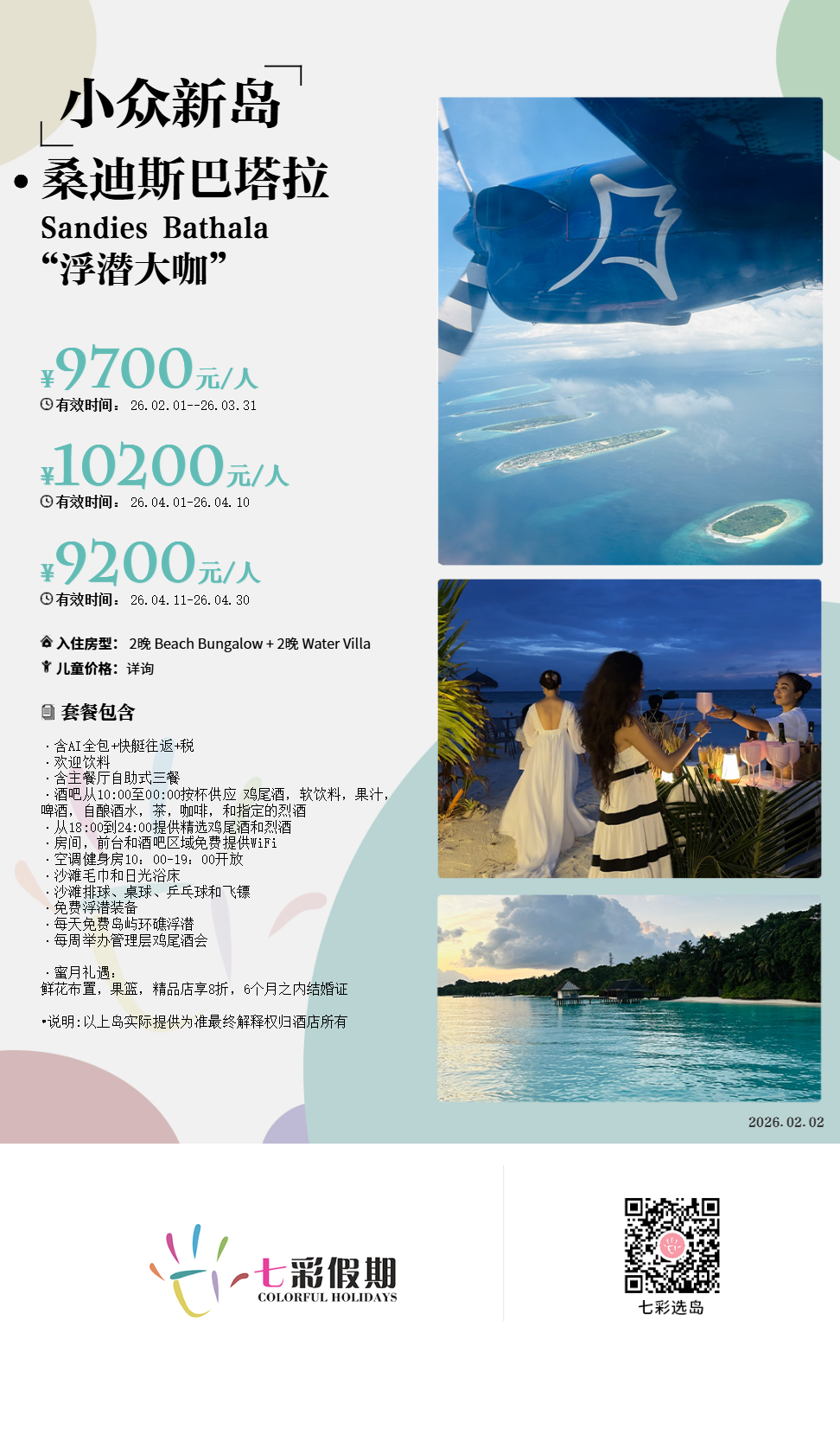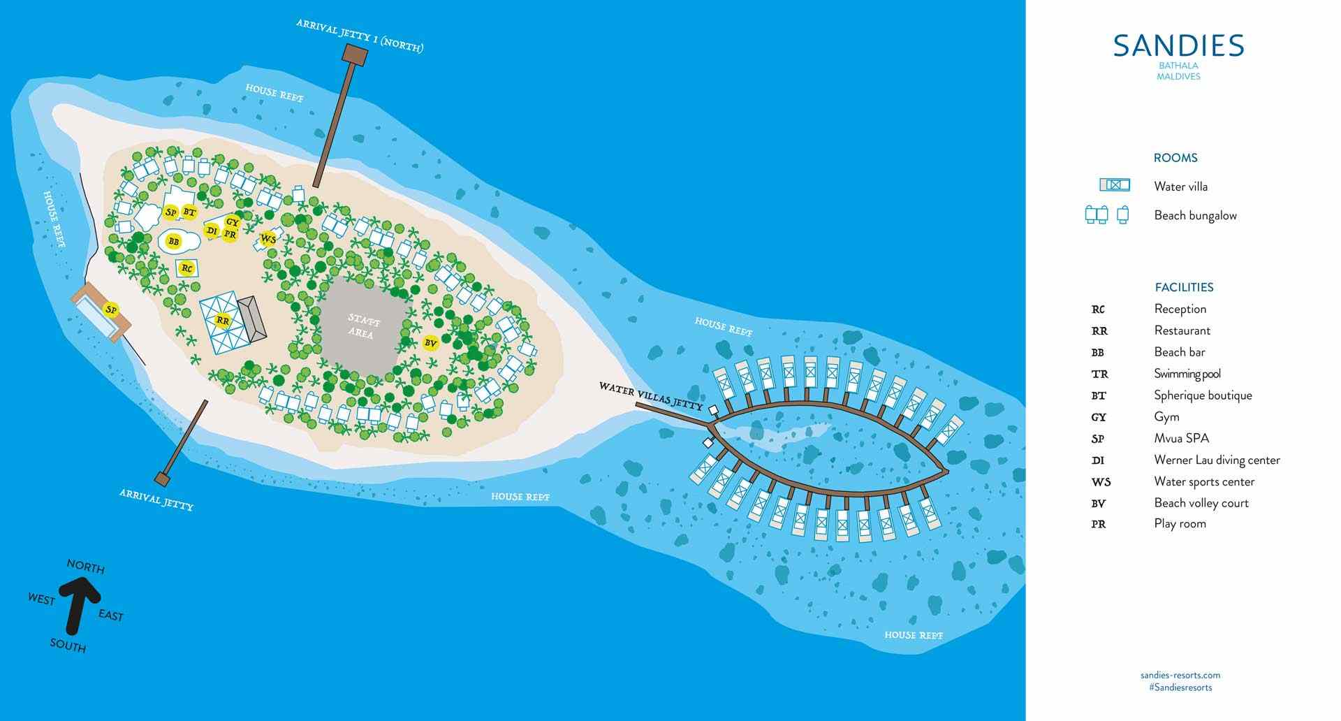桑迪斯巴塔拉(sandies bathala)位于著名的浮潜圣地,阿里环礁,距离马累机场23公里,乘坐15分钟水飞即可到达,整座岛屿的面积为2.9万平米,属于小型岛屿,绕岛一圈仅需10公里,桑迪斯是Planhotel旗下的度假酒店,星级是4星,身处于阿里环礁的酒店,浮潜中心肯定是有的,整座岛屿的设计风格非常简约,深受90后喜爱,比起亲子游,酒店更适合两人的甜蜜蜜月游。