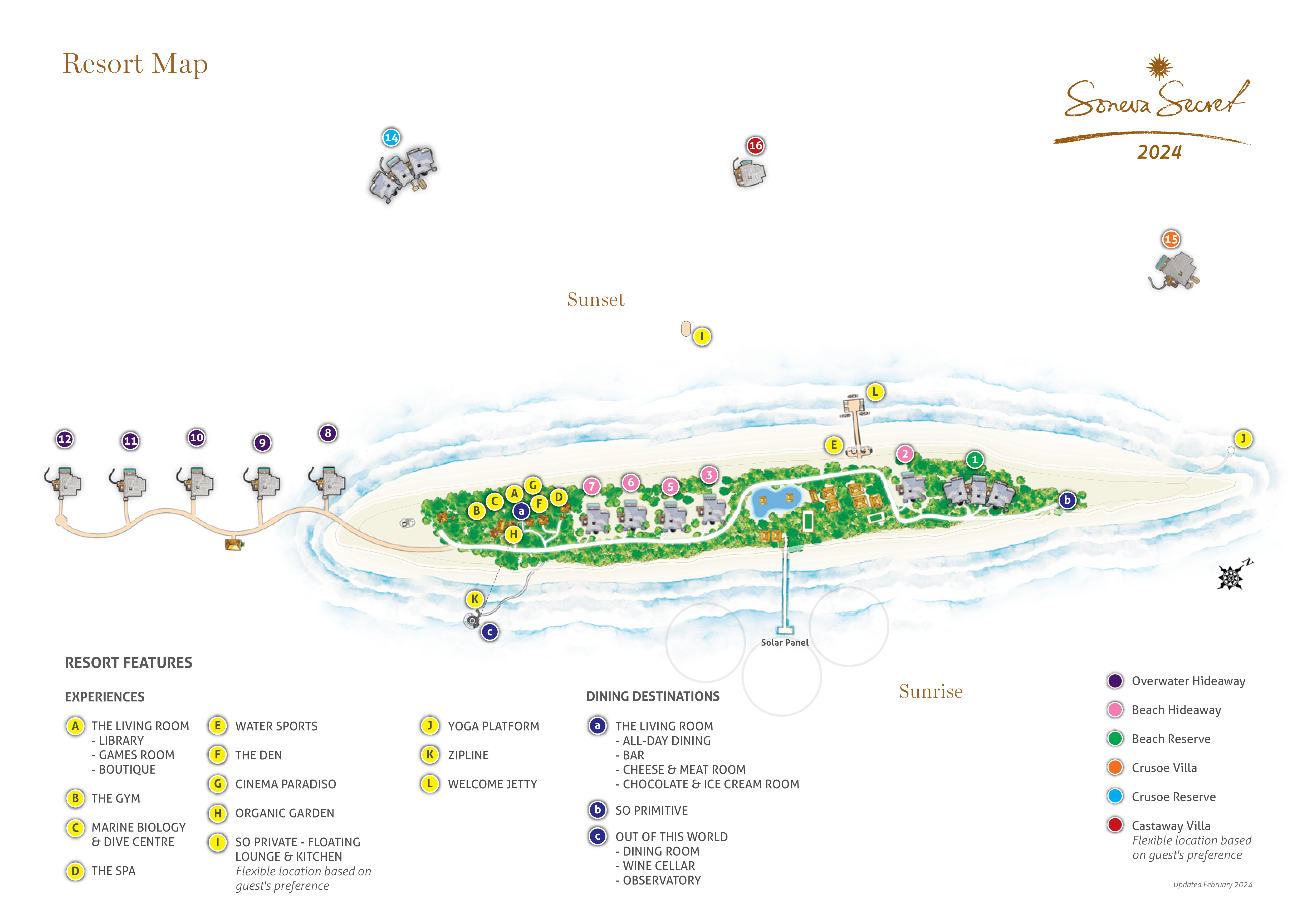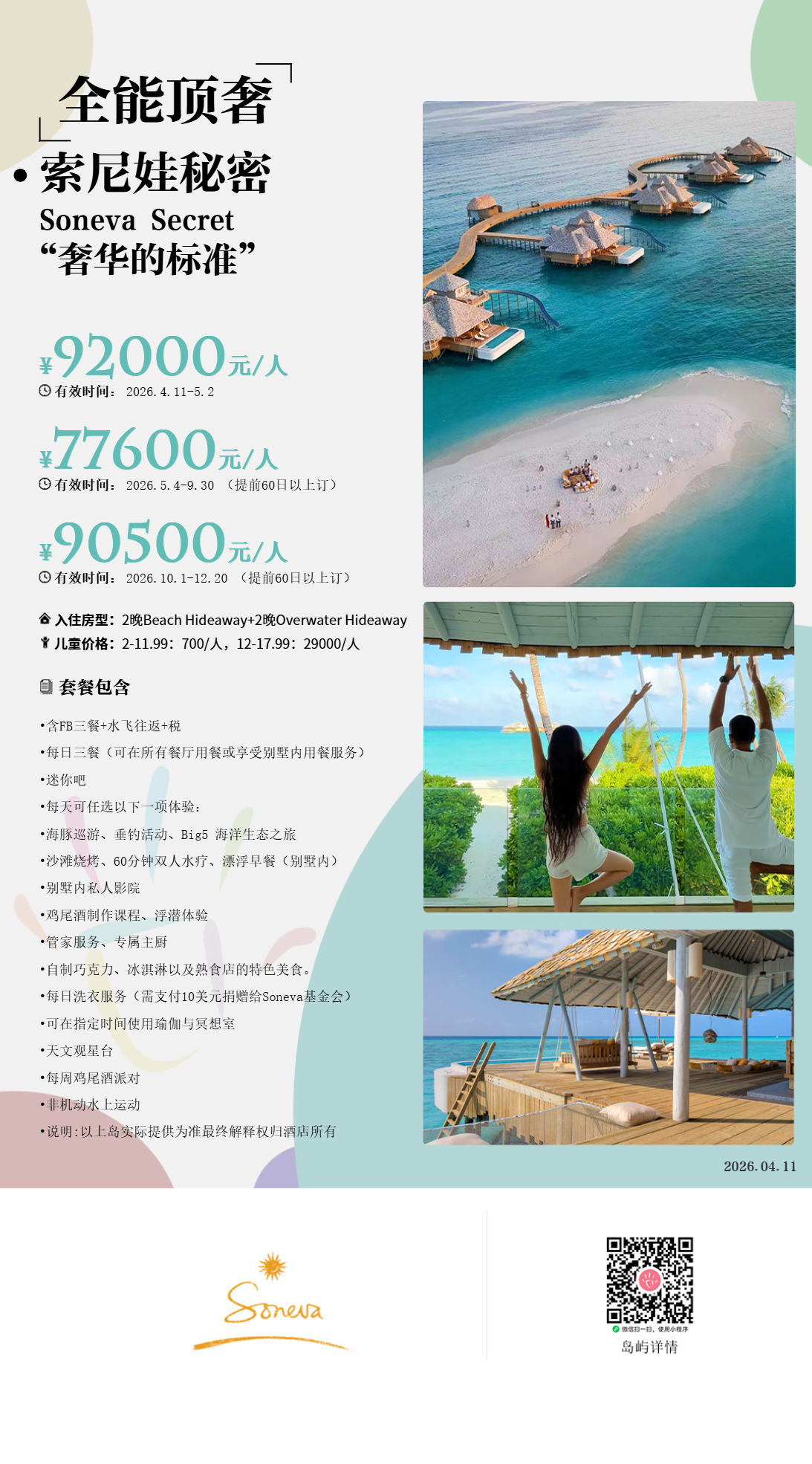 24年,马代热门顶奢岛屿索尼娃秘密带着全新概念的度假村卷土重来,水上浮动别墅和私人定制的餐食,势必将顶奢岛屿拔高到新的高度,索尼娃秘密度假村是哈达鲁环礁的第一家度假村水飞75分钟上岛,也可以选择从巴阿环礁的Soneva Fushi乘坐40分钟的水上飞机、从努努环礁的Soneva Jani乘坐30分钟的水上飞机,或者在Soneva Fushi和Soneva Jani搭乘Soneva in Aqua上的舒适全天游航行前往。还可以选择直飞哈阿达卢环礁的库尔胡杜夫什机场,然后搭乘一小时的快艇前往度假胜地。拥有14栋水上和岛屿别墅,包括马尔代夫唯一的浮动别墅。每栋别墅都设有一支由三人组成的专业团队,其中包括赤脚监护人、赤脚助理和专职厨师,以确保每次入住都完全个性化。每栋别墅都有专属的私人厨师,提供个性化的餐饮服务,提供遍布全球的独特风味。客人还可以在度假村内探索各种精致的美食体验,包括高级葡萄酒搭配和限量版菜单,在我们的漂流餐厅和天文台,免费奶酪和巧克力室等等。