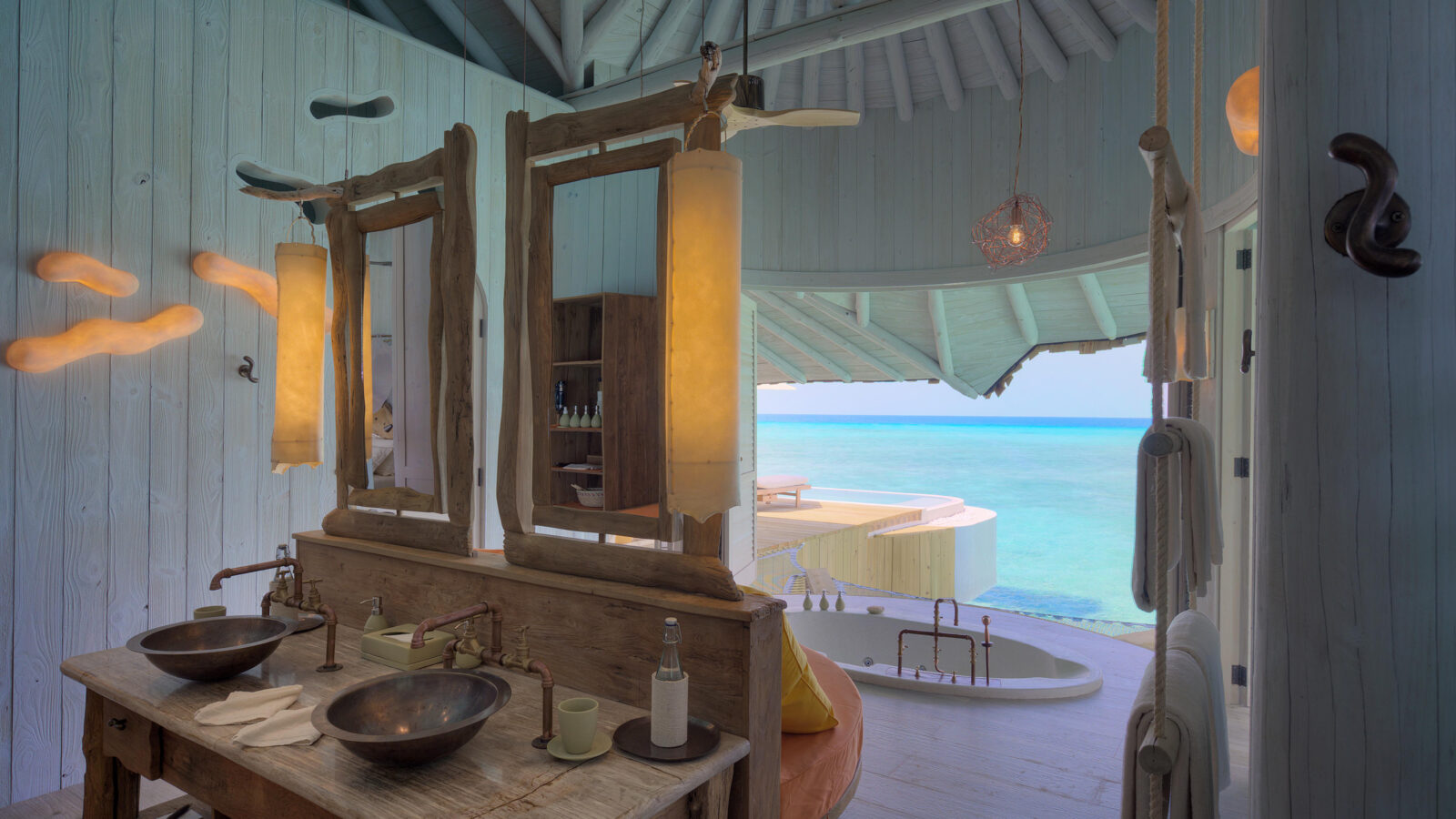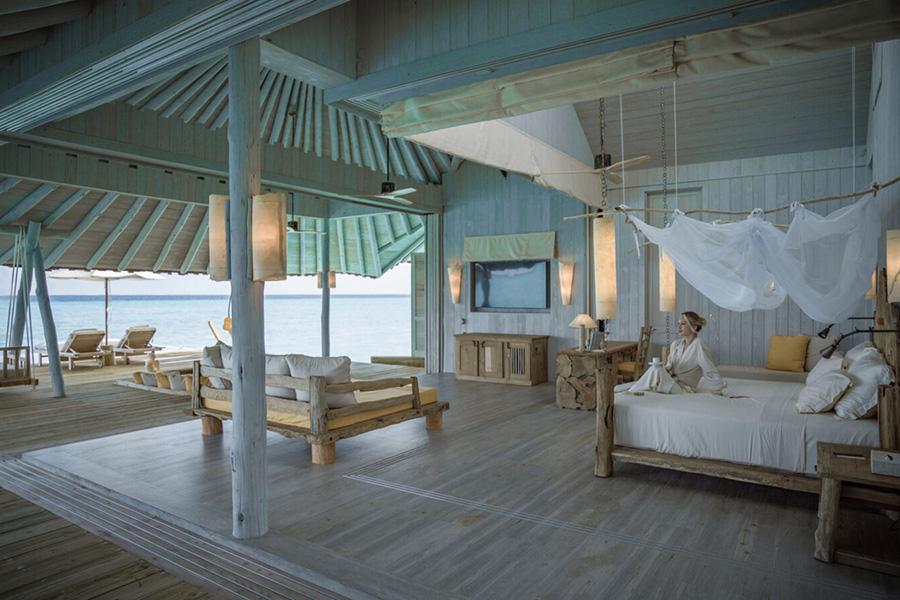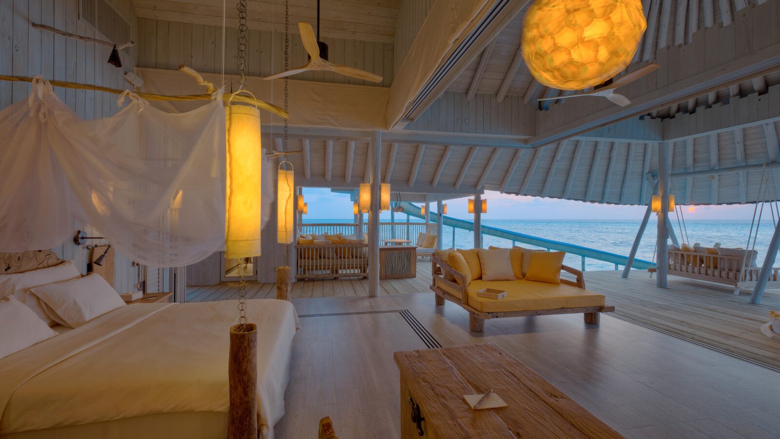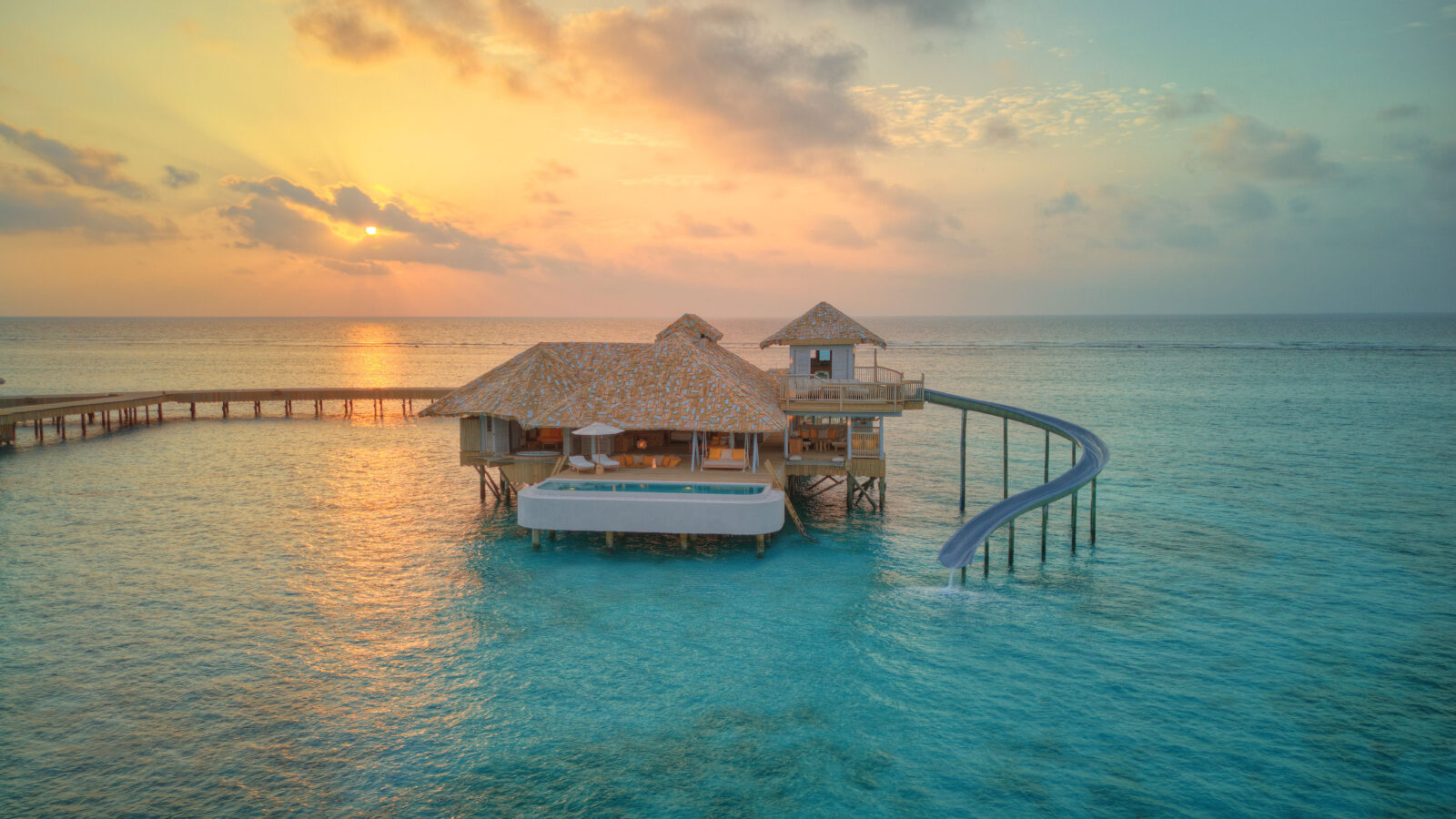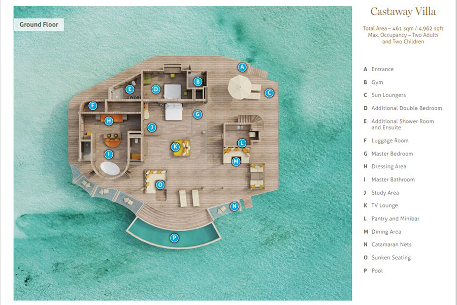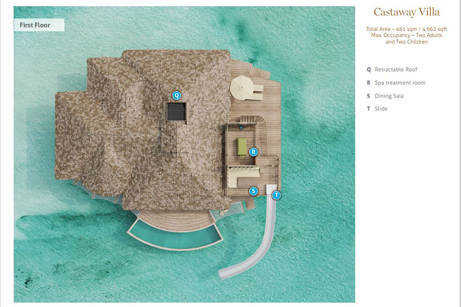 房型介绍:Castaway是马尔代夫首家此类别墅,漂流别墅被有意识地设计为不受海浪运动的影响,只能通过海路进入。这栋宽敞的别墅分布在两层楼,设有索尼娃标志性的海水游泳池和直通泻湖的弧形滑梯,以及主卧室上方的可伸缩屋顶,可观星。主浴室套间设有下沉式浴缸、淋浴、封闭式卫生间和更衣室。别墅后方设有一间带套间淋浴间和卫生间的额外双人卧室,旁边是一间设备齐全的健身房,可俯瞰周围碧绿的海水。一楼还设有食品储藏室和迷你吧、带顶棚的用餐区、带大沙发床和下沉式座椅的家庭大小的电视休息室。楼上设有水疗护理室、泻湖滑水道和户外用餐凉亭,完善了这个私人的专属空间。