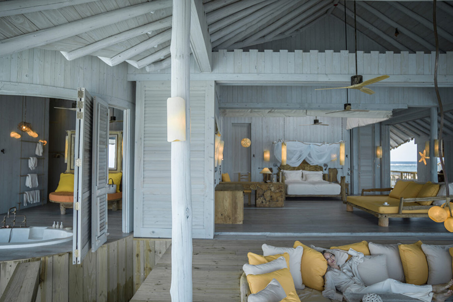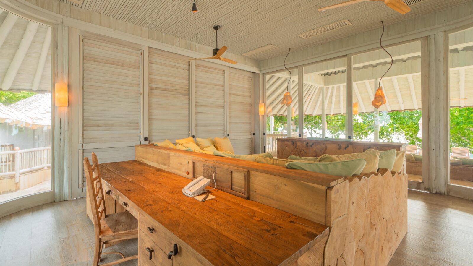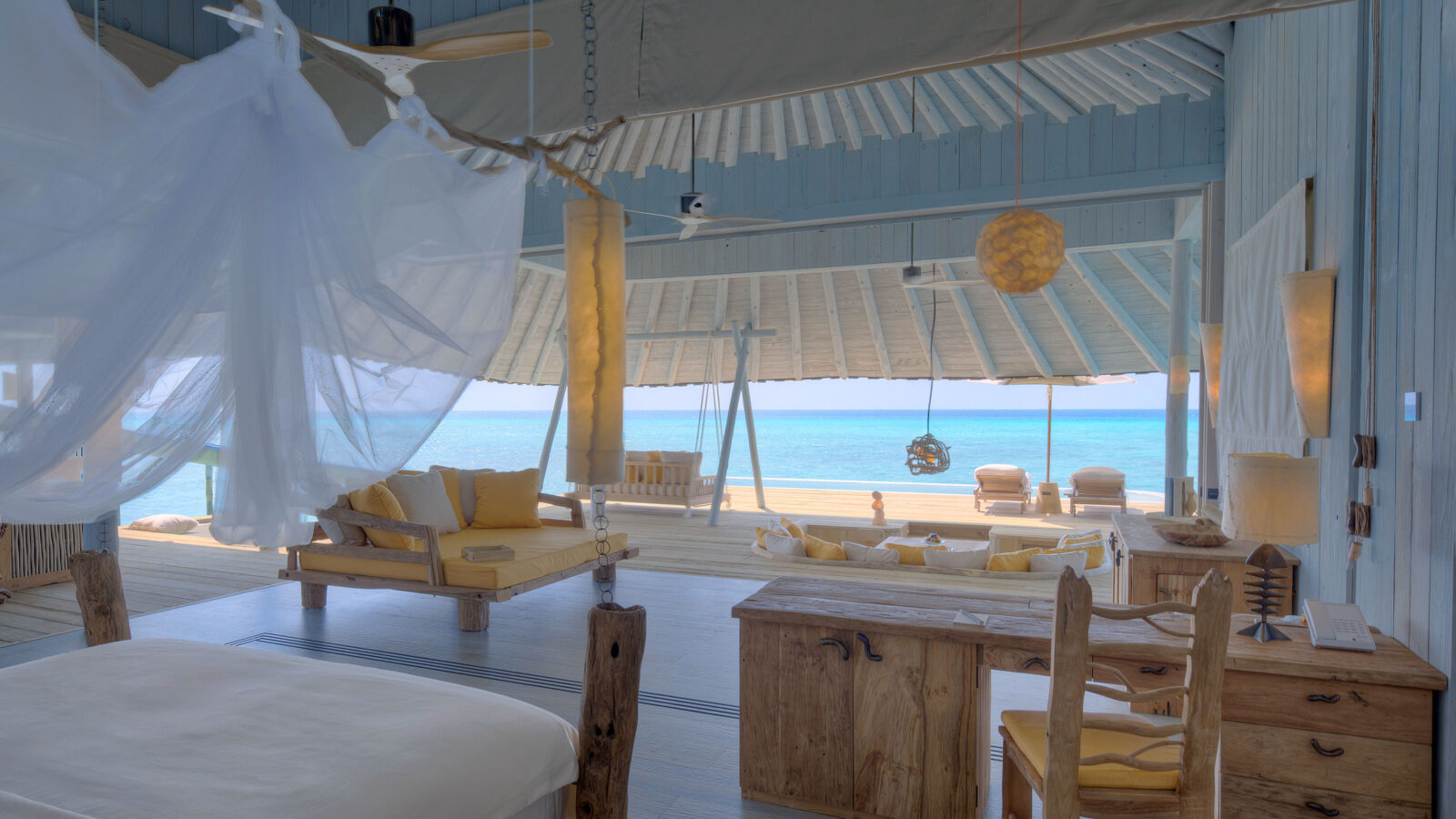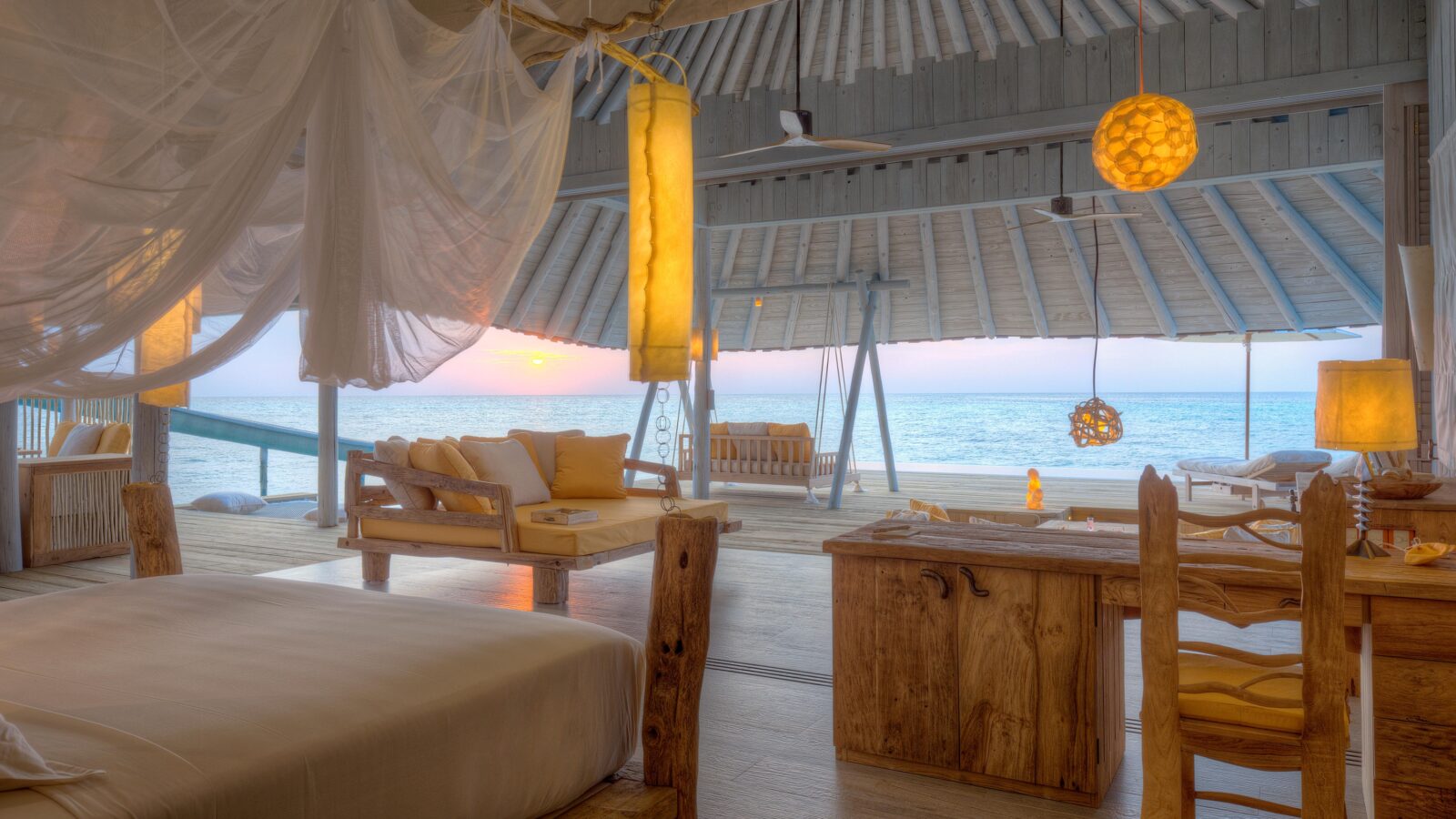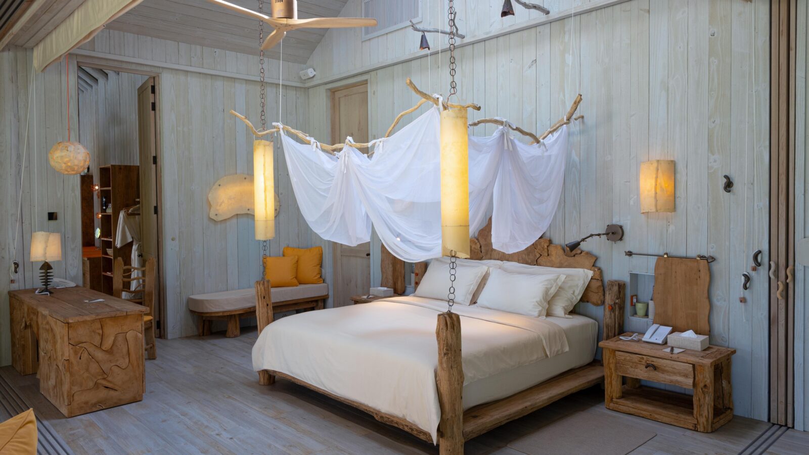 房型介绍:Castaway是马尔代夫首家此类别墅,漂流别墅被有意识地设计为不受海浪运动的影响,只能通过海路进入。这栋宽敞的别墅分布在两层楼,设有索尼娃标志性的海水游泳池和直通泻湖的弧形滑梯,以及主卧室上方的可伸缩屋顶,可观星。主浴室套间设有下沉式浴缸、淋浴、封闭式卫生间和更衣室。别墅后方设有一间带套间淋浴间和卫生间的额外双人卧室,旁边是一间设备齐全的健身房,可俯瞰周围碧绿的海水。一楼还设有食品储藏室和迷你吧、带顶棚的用餐区、带大沙发床和下沉式座椅的家庭大小的电视休息室。楼上设有水疗护理室、泻湖滑水道和户外用餐凉亭,完善了这个私人的专属空间。