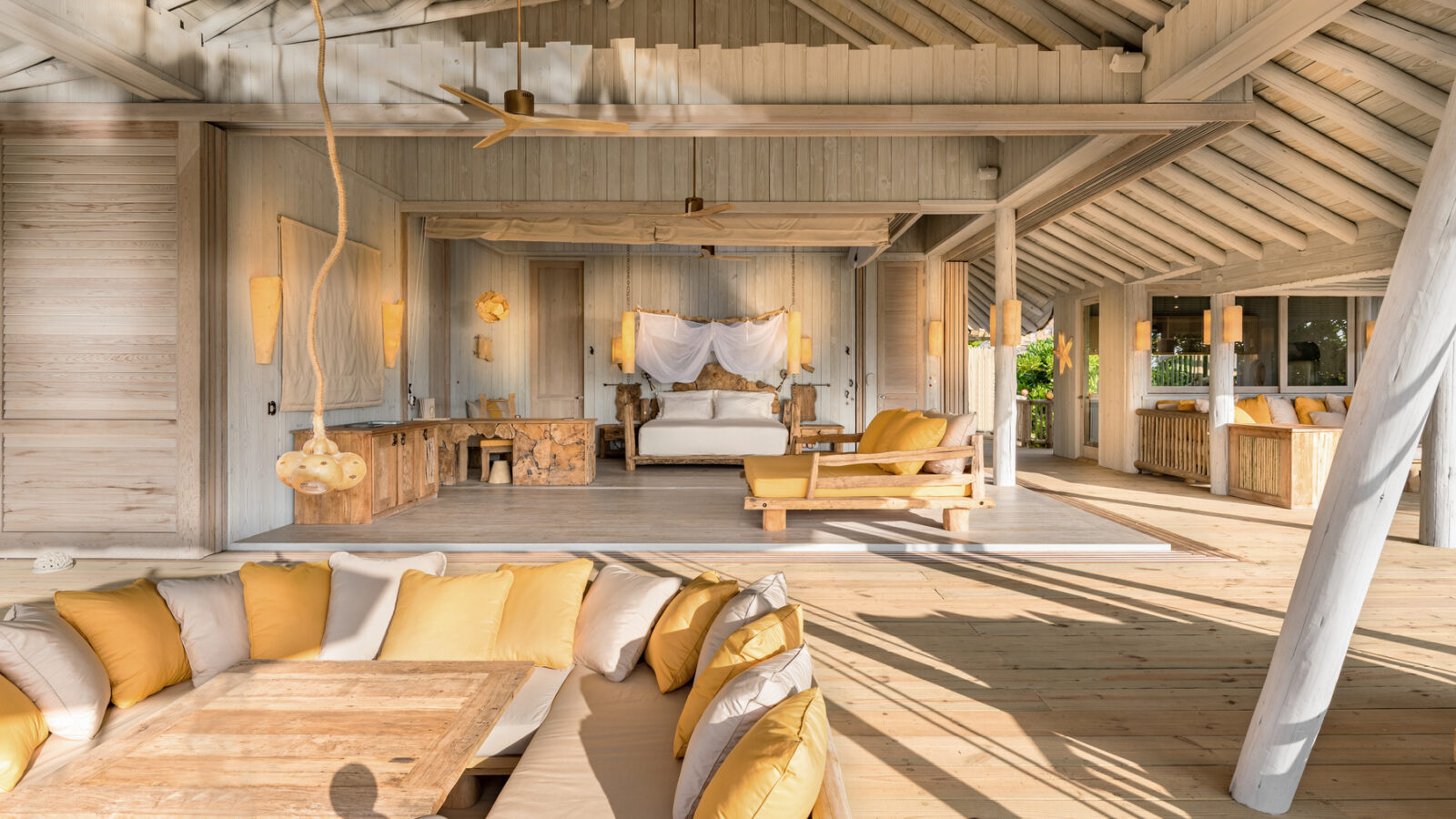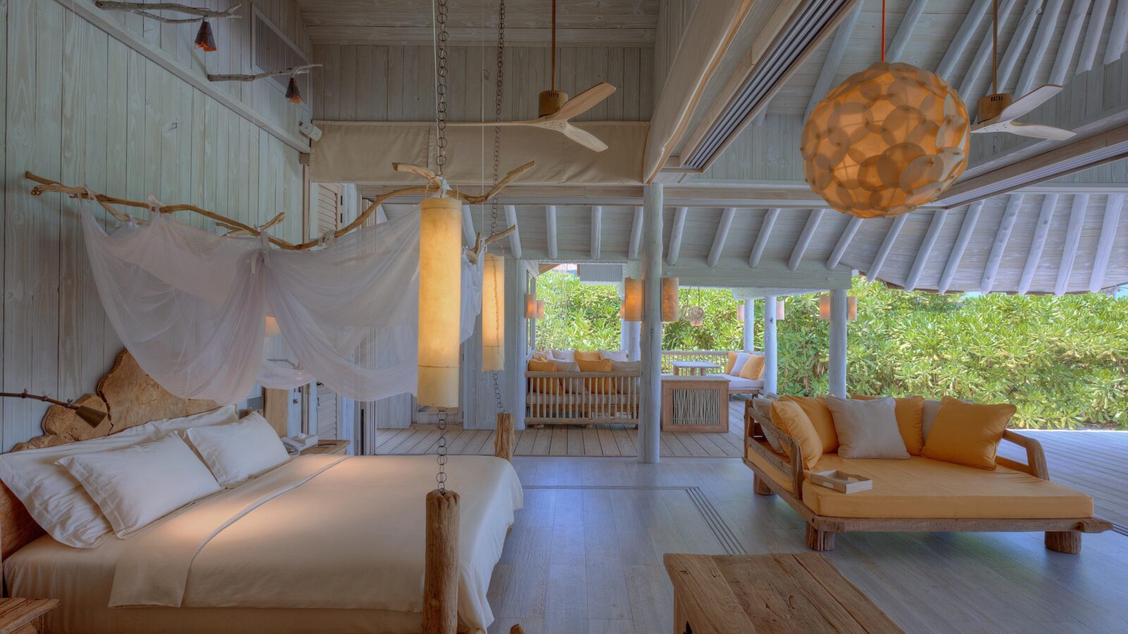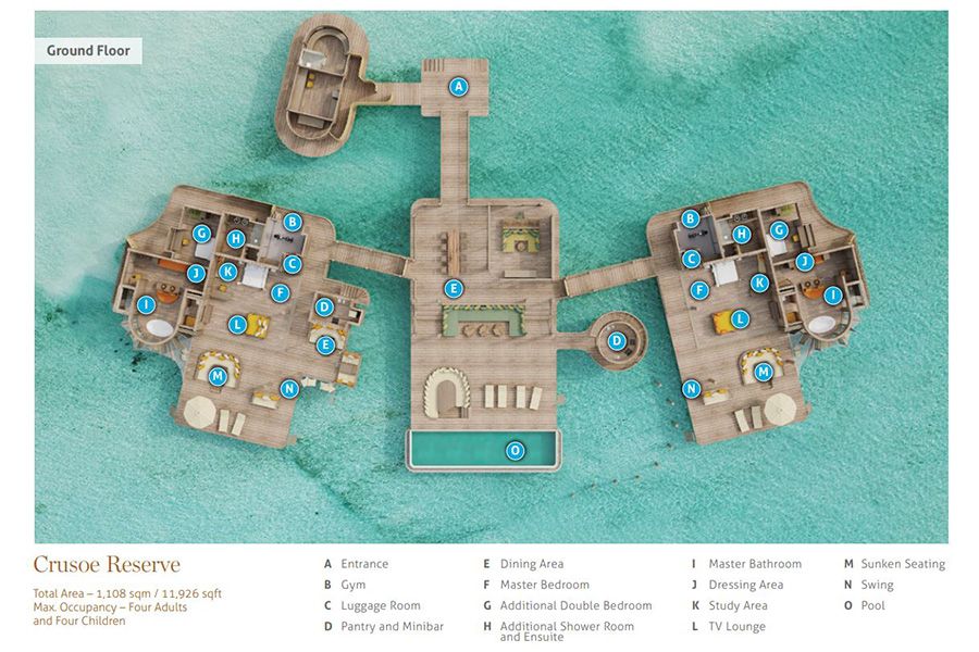 房型介绍:这栋奢华的别墅分布在两层楼,设有两间带可伸缩屋顶的主卧室和两间相邻的双人卧室,每间卧室都有自己的套间、花园淋浴和卫生间。宽敞的室内外起居区比比皆是,包括高低用餐区、家庭大小的电视休息室和舒适的沙发床、学习区、设备齐全的健身房和带迷你吧的茶水间。楼上设有带沙发床的户外用餐凉亭和俯瞰泻湖的spa理疗室。