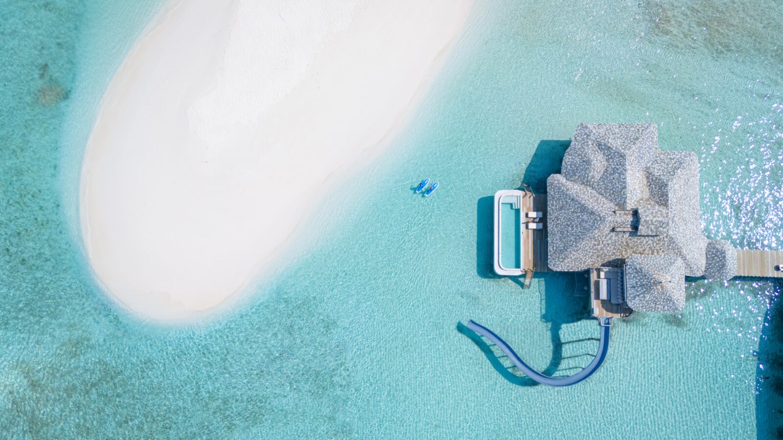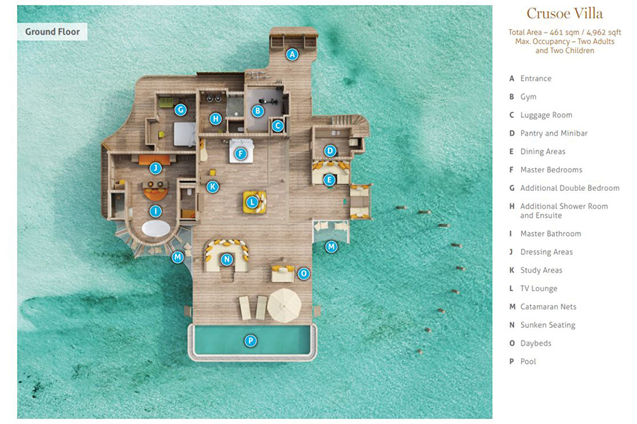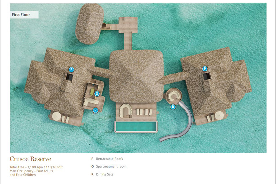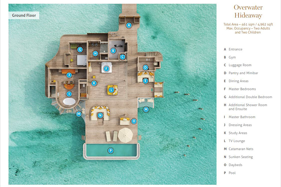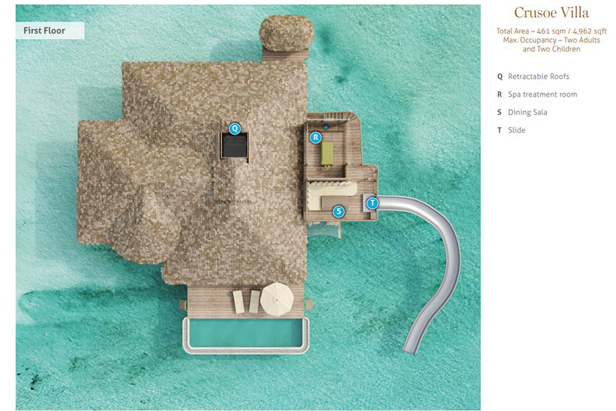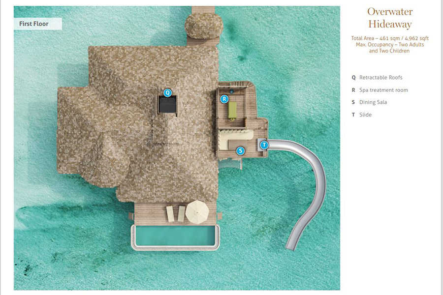 房型介绍:宽敞的水上世外桃源在一楼设有宽敞的主卧室,并设有相邻的套间浴室、卫生间和更衣室。主卧室上方的可伸缩屋顶只需按一下按钮即可向后滑动,露出星空,而标志性的户外浴室则配有下沉式浴缸、淋浴间和卫生间。还有一个相邻的儿童卧室,配有套间淋浴和卫生间。一楼还设有带大沙发床的开放式客厅、书房、设备齐全的健身房、带迷你吧的储藏室和户外用餐区。大型户外甲板设有私人淡水游泳池、下沉式用餐区、沙发床和供客人休息的双体船网。同时,一楼设有水疗室、带沙发床的用餐凉亭和通往泻湖的弧形滑水道。