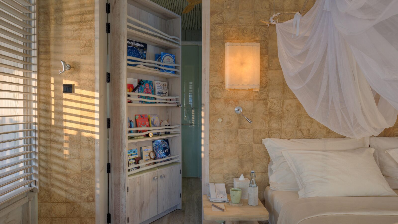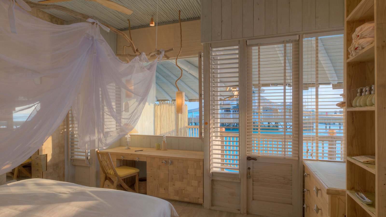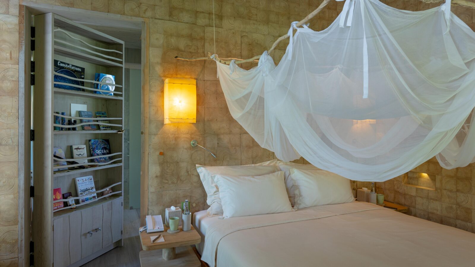 房型介绍:宽敞的水上世外桃源在一楼设有宽敞的主卧室,并设有相邻的套间浴室、卫生间和更衣室。主卧室上方的可伸缩屋顶只需按一下按钮即可向后滑动,露出星空,而标志性的户外浴室则配有下沉式浴缸、淋浴间和卫生间。还有一个相邻的儿童卧室,配有套间淋浴和卫生间。一楼还设有带大沙发床的开放式客厅、书房、设备齐全的健身房、带迷你吧的储藏室和户外用餐区。大型户外甲板设有私人淡水游泳池、下沉式用餐区、沙发床和供客人休息的双体船网。同时,一楼设有水疗室、带沙发床的用餐凉亭和通往泻湖的弧形滑水道。
