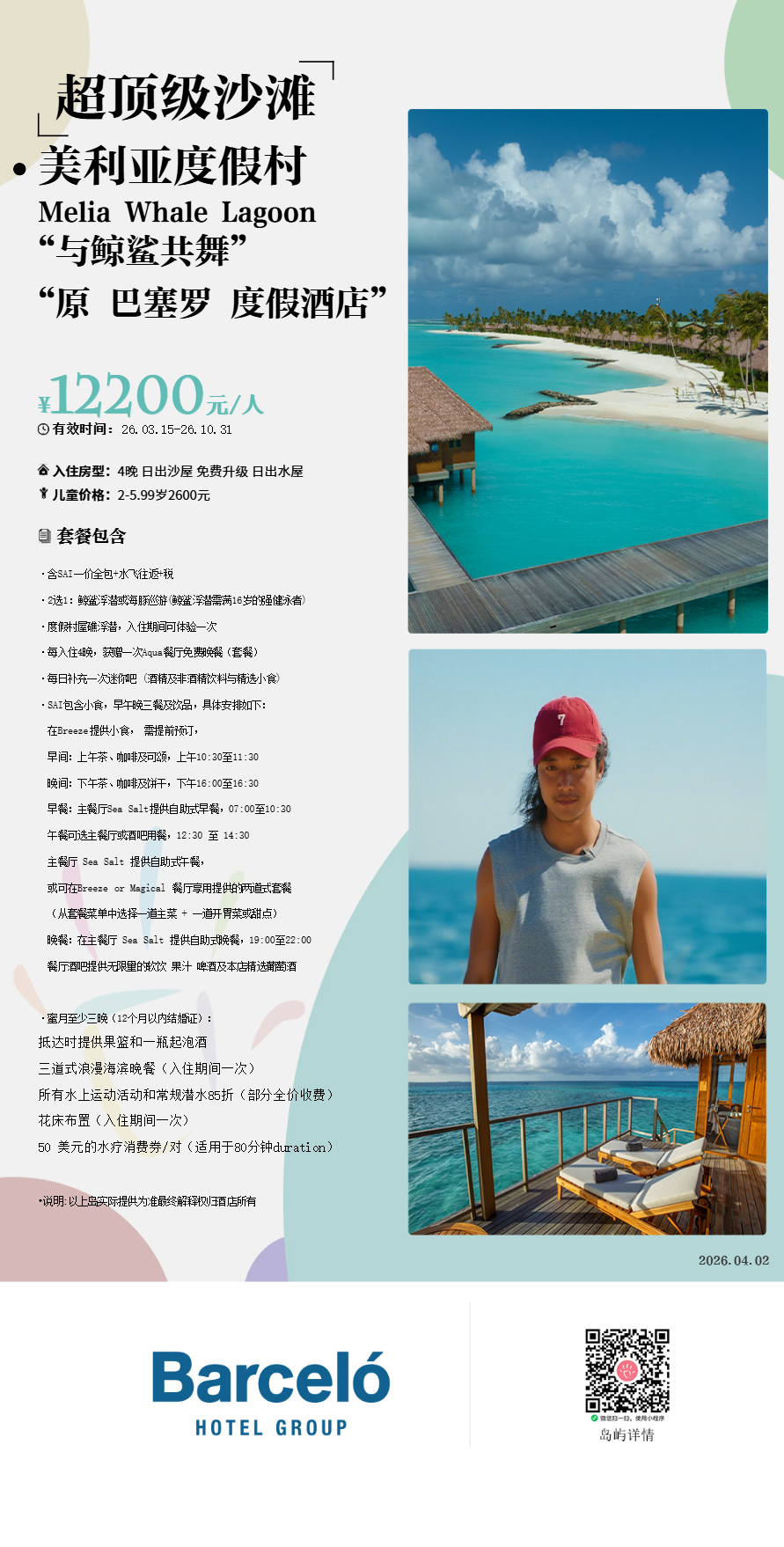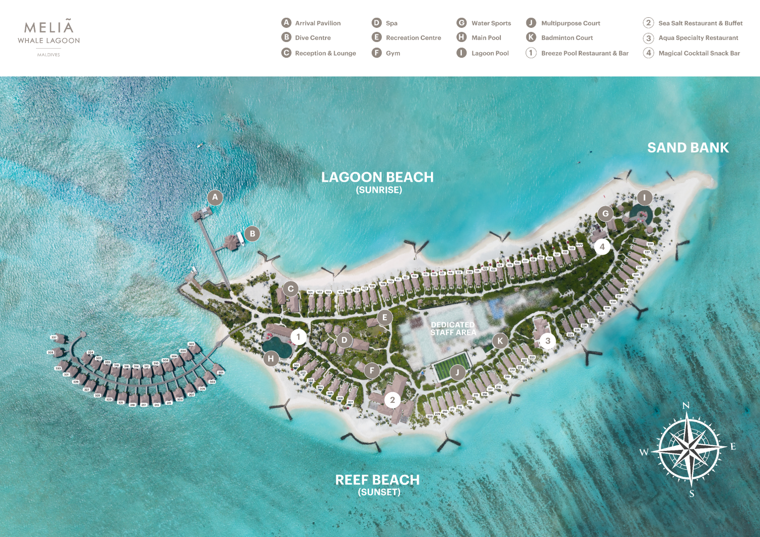 马尔代夫美利亚度假酒店,位于南阿里环礁(Meliá Whale Lagoon Maldives 原名巴塞罗度假村Barcelo Whale Lagoon Maldives),距离马累有50公里,乘坐水飞30分钟即可上岛。