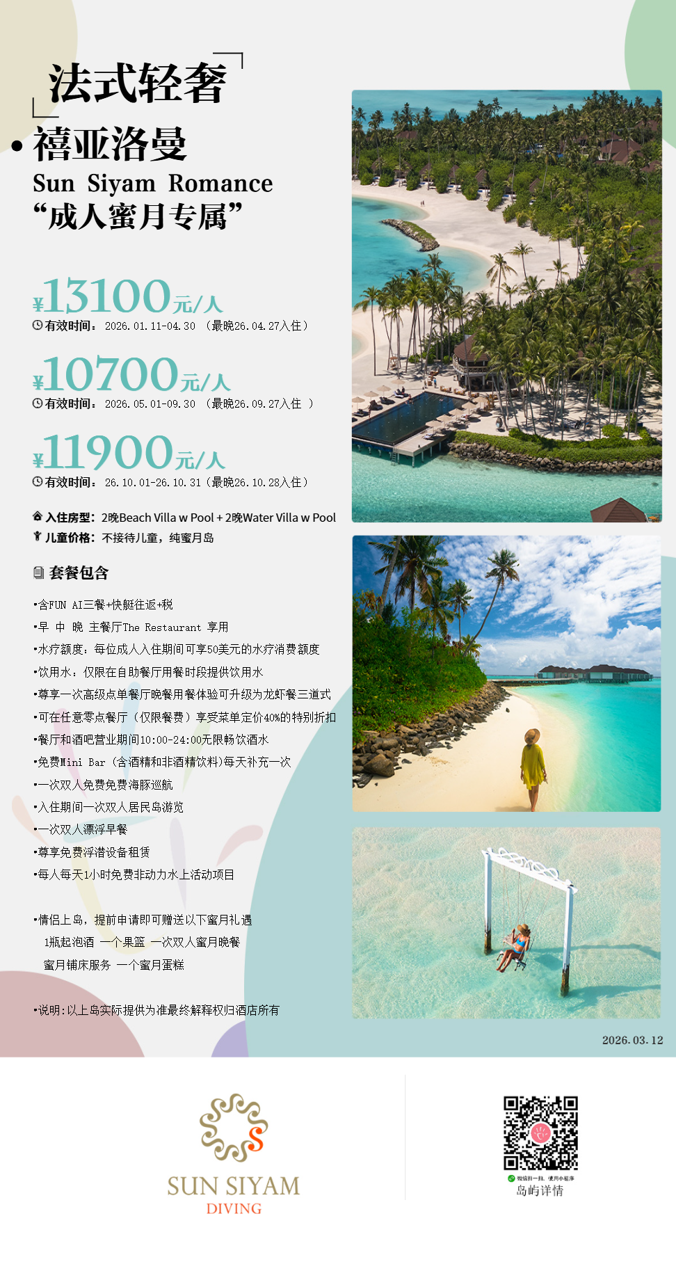 禧亚集团首家豪华五星纯蜜月岛屿只接待16岁以上的客人