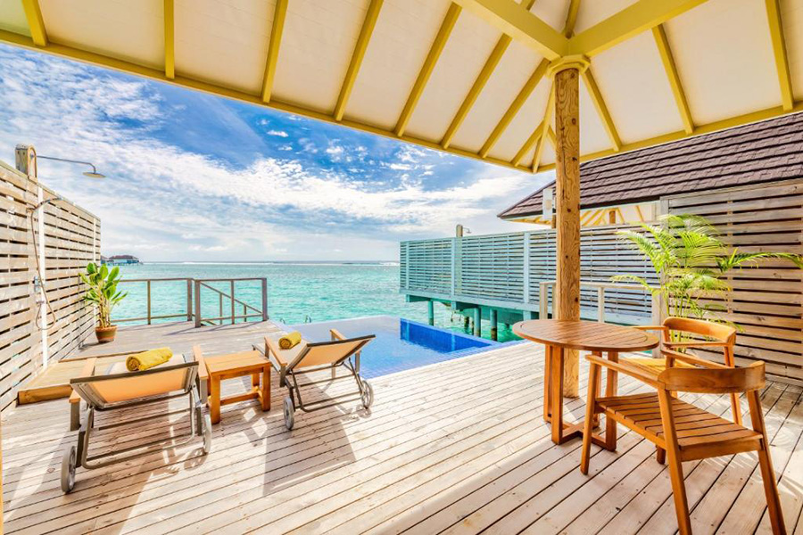 房型介绍:房间面积为112㎡,拥有无边框私人泳池,别墅位于Tiffany蓝的泻湖之上,只接待16岁以上的客人,非常高的私密性,不会被孩童打扰,可以放心享受浪漫的二人世界,即使躺在床上,也能直观的看到蔚蓝的大海。