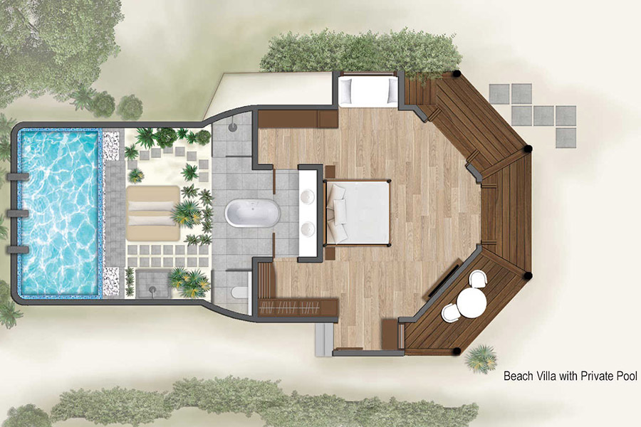 房型介绍:海滩套房占地 150 平方米,拥有 150 平方米的豪华空间,非常适合寻求安静海滩度假胜地的客人,拥有额外的空间、私人游泳池和迷人的景色。在您的私人避风港放松身心,欣赏白色沙滩的美景,迎接绿松石泻湖。客人可以在弹出式起居区休息,或在海滩上享受别墅内的游泳池。