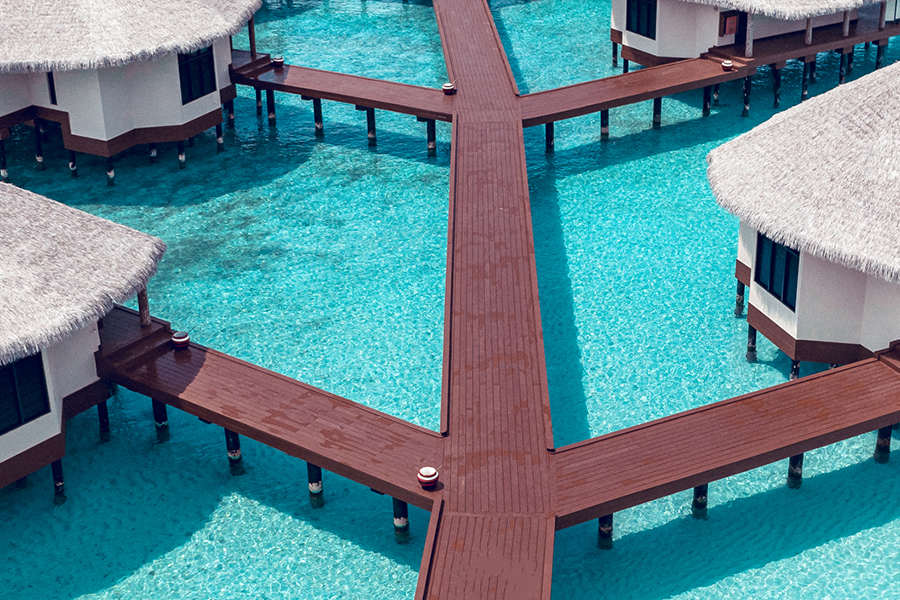 房型介绍:水上别墅位于青松石环礁湖的上方,是安心度假的完美场所,水上别墅由一间卧室、起居区和浴室组成,房间面积为150㎡。