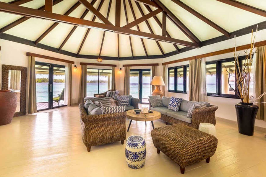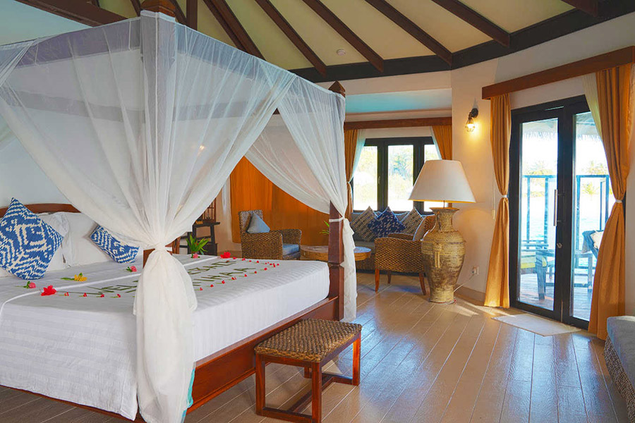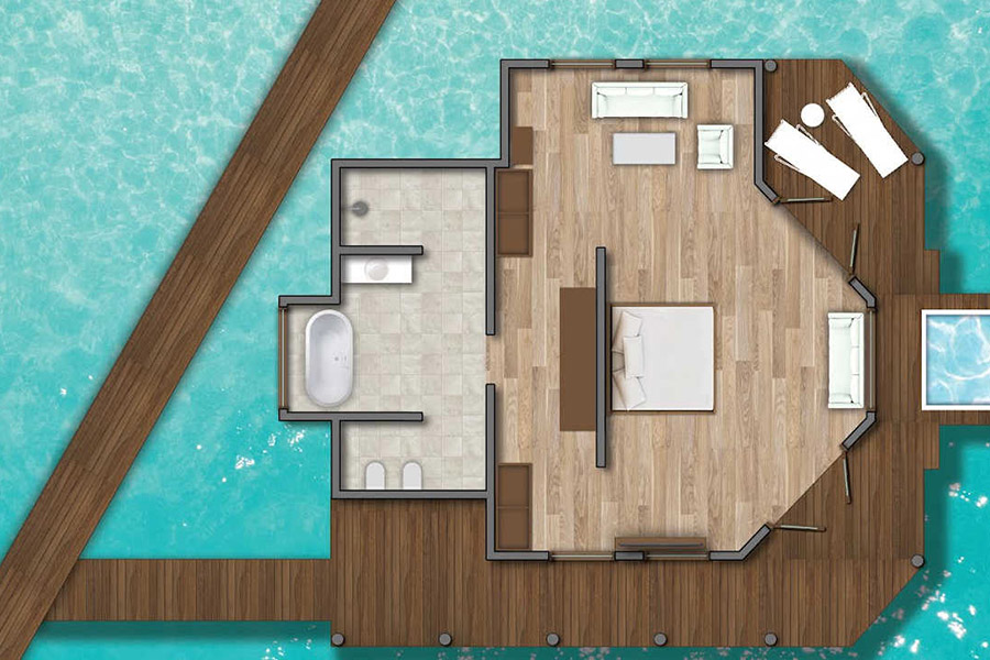 房型介绍:水上别墅位于青松石环礁湖的上方,是安心度假的完美场所,房间面积为270㎡。