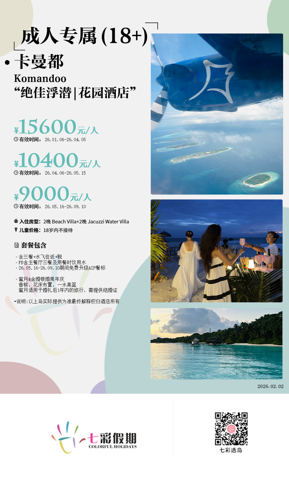 房型介绍:Komandoo酒店浪漫的高级按摩浴缸海滩别墅距离泻湖仅几步之遥,面朝日出。优雅的别墅排列在环绕热带岛屿的美丽粉白色沙滩上。这里的珊瑚礁很浅,坡度平缓,有成群结队的鱼。