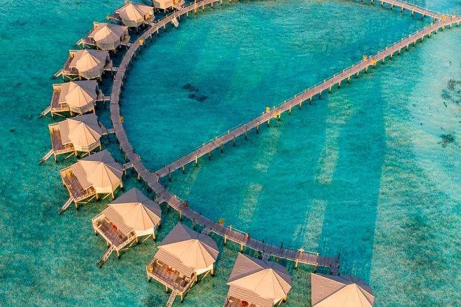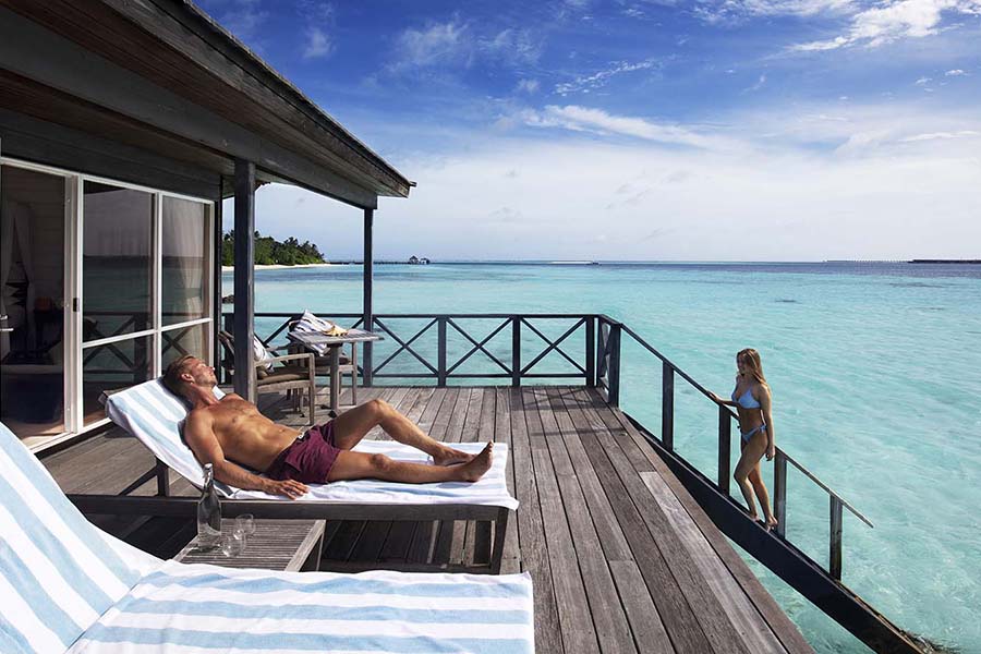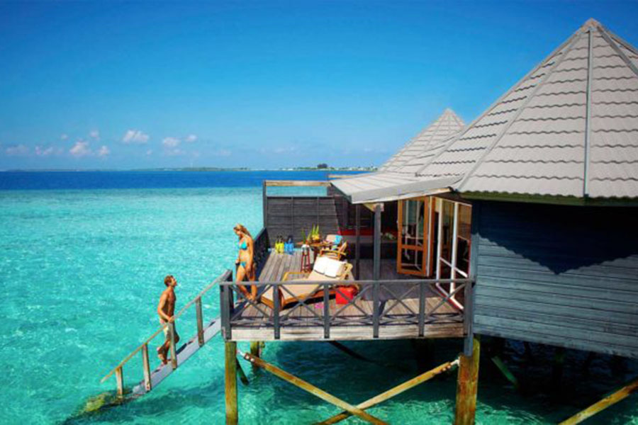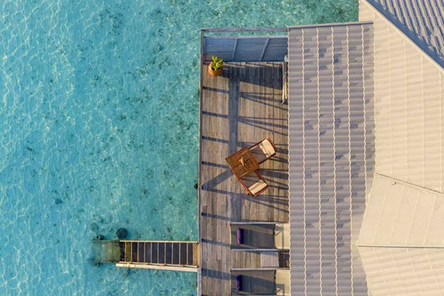 房型介绍:Komandoo最令人向往的别墅保证了您在天堂般的住宿的豪华和浪漫的氛围。一个部分屋顶的大型木制甲板,带有通向大海的楼梯,为您提供了乌托邦的私人空间。泻湖的宁静是完美的避难所,使这些别墅成为您度蜜月或与爱人浪漫之旅的明显选择。在您自己的按摩浴缸、水疗浴缸中享受美妙的沐浴,同时凝视着地平线,蔚蓝的海水与蓝宝石色的天空相遇。
