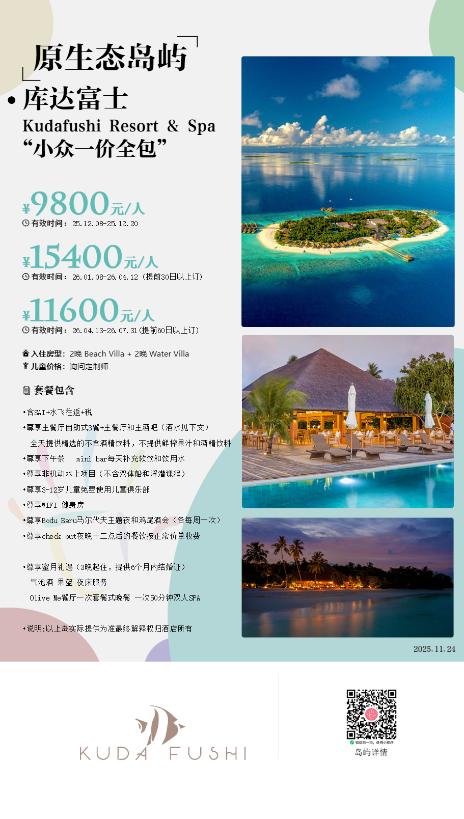 马尔代夫库达富士(Kudafushi Resort & Spa)位于著名的拉环礁,从马累国际机场到度假村有45分钟的路程(根据独立水上飞机的时间表估计) 。在无边无际的生命海洋中充满光芒的“库达”宝石,与大自然的绿色相遇 清澈见底的海水,而白色的珊瑚海滩则定义了边界。酒店于2017年开业,设施相对较新,酒店拥有3间餐厅2间酒吧,为此还推出了超高性价比的全包内容,每天都能放肆吃喝,不用在意钱包的感受,除去餐饮,酒店还提供儿童俱乐部,解放带娃父母的双手,孩子和大人都能获得各自的快乐。而蜜月方面酒店也会提供婚礼,蜜月服务,无论是蜜月还是亲子都有选择这座岛的理由。