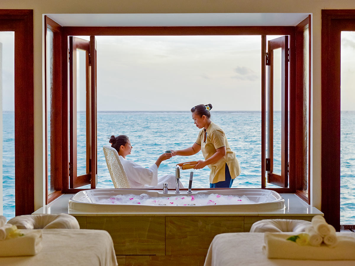 在我们的水上水疗中心,将自己的身体和心灵交给我们专业治疗师舒缓的双手,一望无际的大海的终极全景让您沉浸在有节奏的平静中。我们的理疗师采用传统的修复疗法、草药、精油、香料和鲜花,结合历史悠久的仪式,在热情的微笑和舒缓、熟练的双手下,让您的感官平静下来,以平衡身体、思想和灵魂。提供多种按摩和瑜伽教程。营业时间是从9:00至20:00。