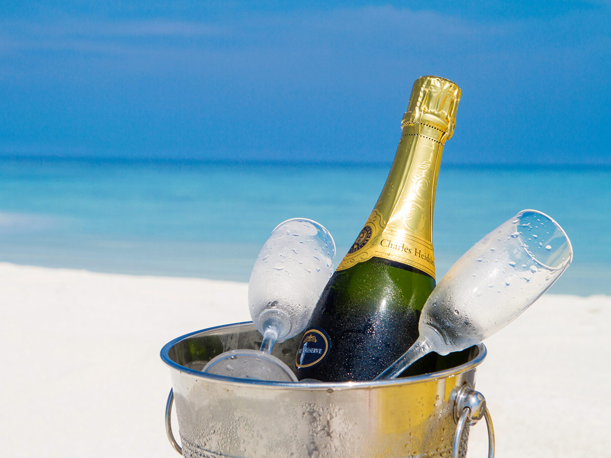前往纯白色的海滩,在那里,您周围什么都没有,也没有人 - 只有当您啜饮香槟和小吃时,大海越来越深的蓝色渐变。