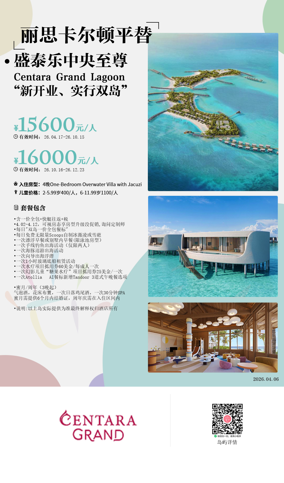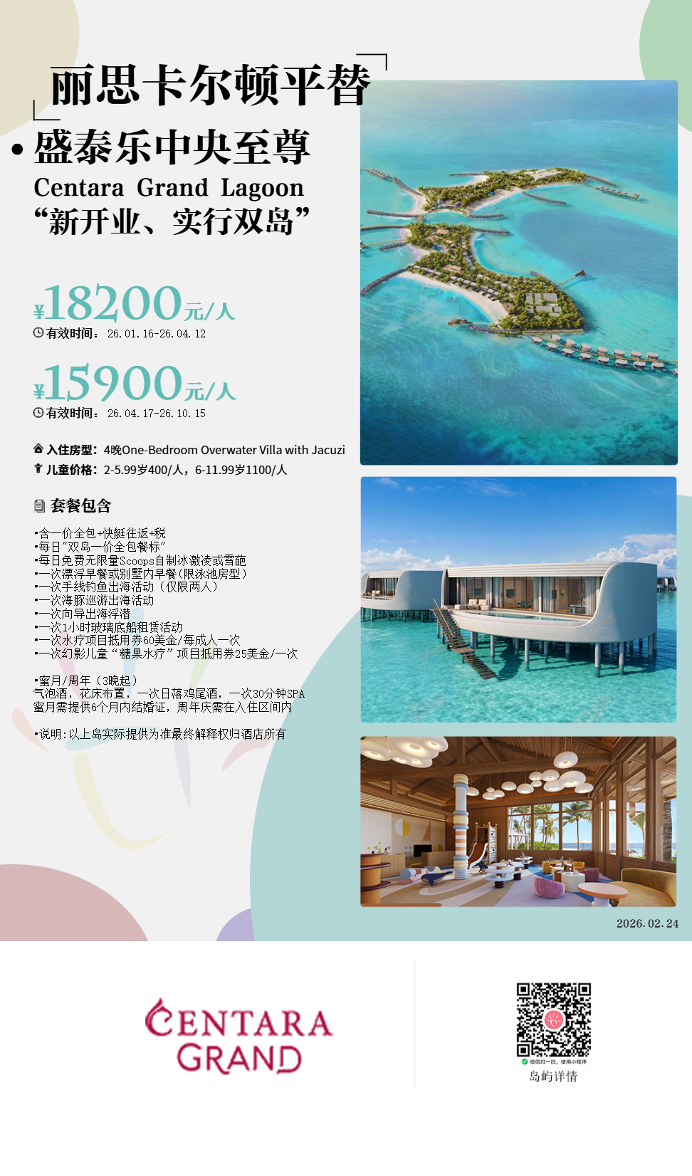 房型介绍:有15间大床房和15间双床房。单卧室水上泳池别墅面积为 100 平方米,可直接通往泻湖,让您倍感舒适。您可以在私人泳池中悠闲畅游,还可以在带浴缸和淋浴的宽敞浴室、纯平电视以及甲板上欣赏壮丽的海景。最多可容纳 3 名成人或 2 名成人和 1 名儿童,采用特大床或双人床。