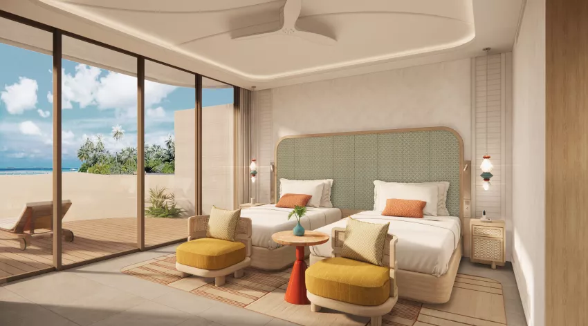 房型介绍:主卧是大床房,次卧是双床房。豪华双卧室水上泳池别墅提供 166 平方米的宁静起居空间、可悠闲畅游的私人泳池和现代浴室,可直接通往泻湖,在清澈的海水中畅游,让您尽享海洋全景。这栋别墅非常适合寻求领略马尔代夫自然美景的家庭或团体入住,最多可容纳 5 名成人或 4 名成人和 1 名儿童。