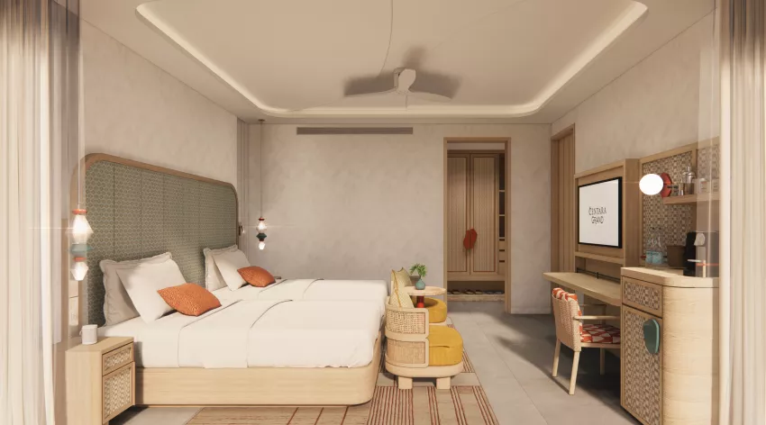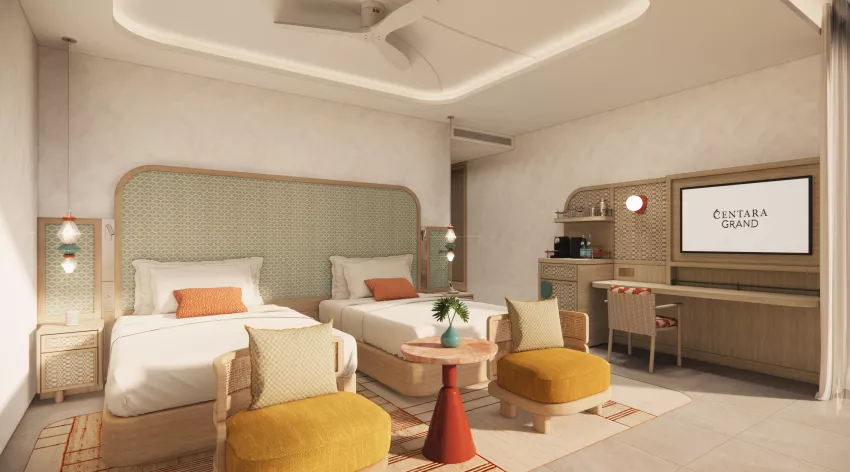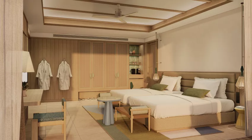 房型介绍:主卧是大床房,次卧是双床房。豪华双卧室海滩泳池别墅是家庭或团体的理想之选,提供 105 平方米的现代起居空间,设有私人泳池,可通往私人海滩。每间卧室均设有自己的现代浴室,并配有共用起居区和现代设施,确保每位客人都能享受轻松的住宿体验,几步之遥即可欣赏舒缓的海洋声音。最多可容纳 5 名成人或 4 名成人和 1 名儿童。