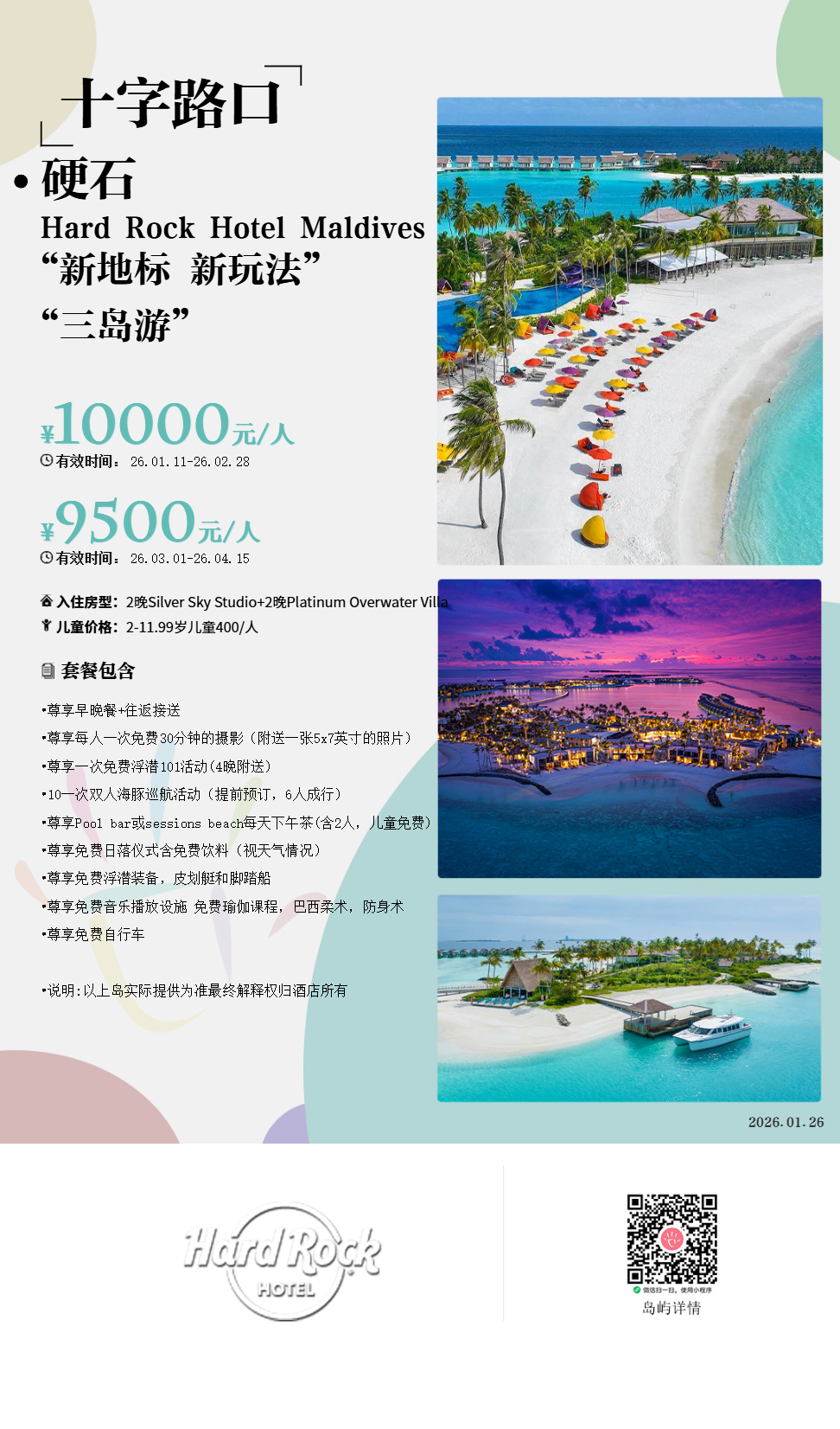 马尔代夫十字路口Crossroads(Marrina&SAii Lagoon&Hard Tock)由客丝路MARINA、萨利泄湖(赛伊)和硬石酒店构成,,将会成为马尔代夫新地标,是马尔代夫历史上最独特的项目之一,由三个岛组成,一个Crossroads岛和两家全新度假村,马尔代夫Hard Rock酒店和希尔顿Curio精选酒店。距离马累国际机场仅15分钟快艇可达。岛上拥有全球著名的Hard Rock硬石餐厅、咖啡馆,汇聚来自世界各地的零售和餐饮店,还有马尔代夫第一个文化中心。岛上还设有海滩俱乐部、水上运动和潜水中心、滨海和豪华游艇俱乐部和多功能厅。3个岛屿均有栈桥相连,意味着入住2个度假村体验正宗马尔代夫风格和宁静氛围;而主岛你则能体验更多风景,犹如穿越摩洛哥、地中海、毛里求斯,超多打卡点,而10多个餐饮单元完全可以让你每一餐都不尽相同。房型特别多,满足各种人群需求,而价格是相当的亲民。赛伊岛198 间房,硬石岛178间房。