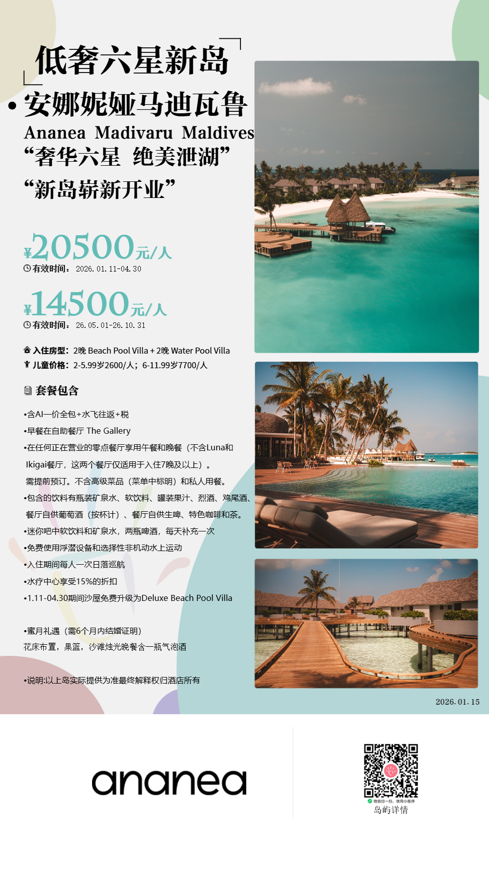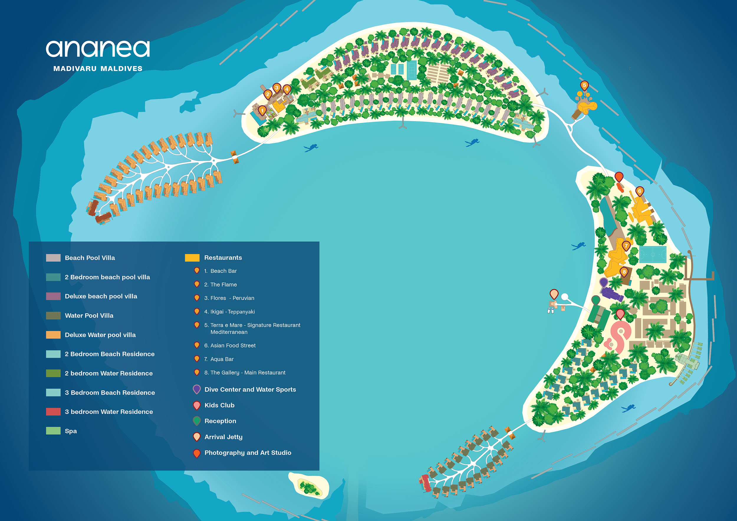 欢迎来到 ananea Madivaru Maldives,这是您在北阿里环礁中心的梦想目的地。度假村横跨两个岛屿,由水上码头连接,拥有白色沙滩、中心的大型泻湖和拥有丰富海底世界的珊瑚礁。前往岛上的交通是乘坐水上飞机,大约需要 20 分钟。ananea 品牌的精致设计与马尔代夫的文化和传统保持一致。