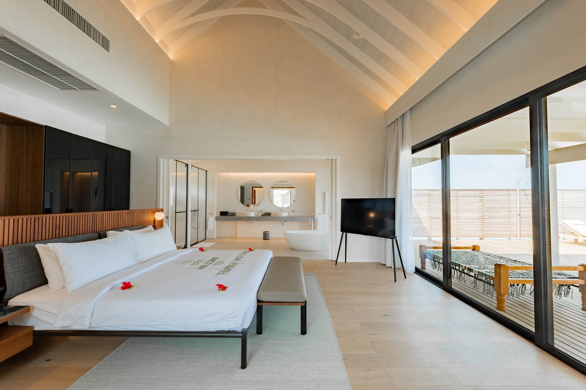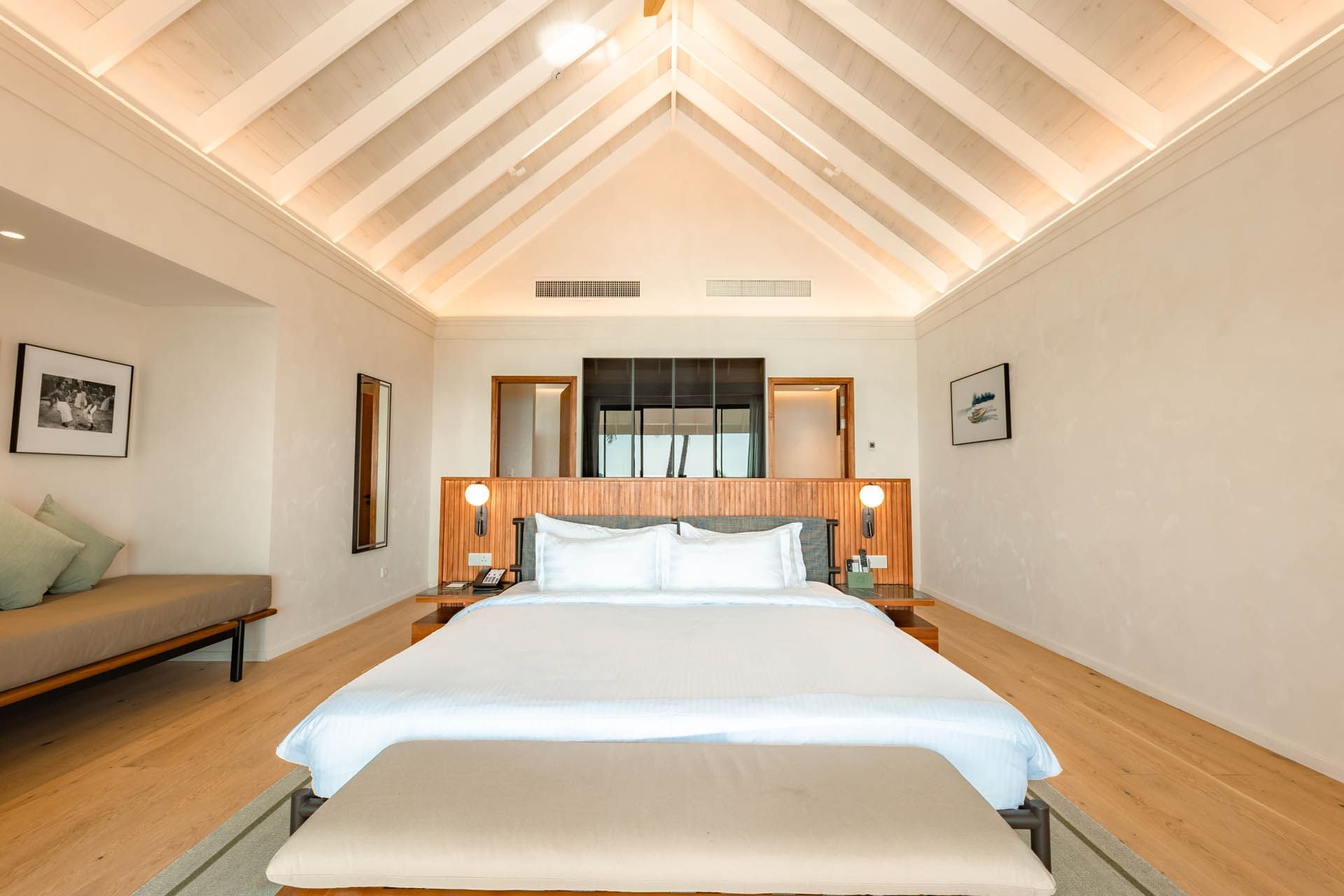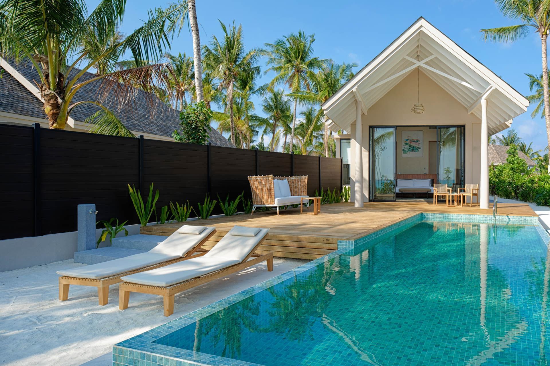 房型介绍:位于副岛,这座独特的双卧沙滩泳池别墅,坐落于洁白的沙滩上,拥有宽敞的室内空间和露天甲板,每个套房都配有私人泳池,距离沙滩和周围的泻湖仅几步之遥,是家庭和团体度假的理想选择。