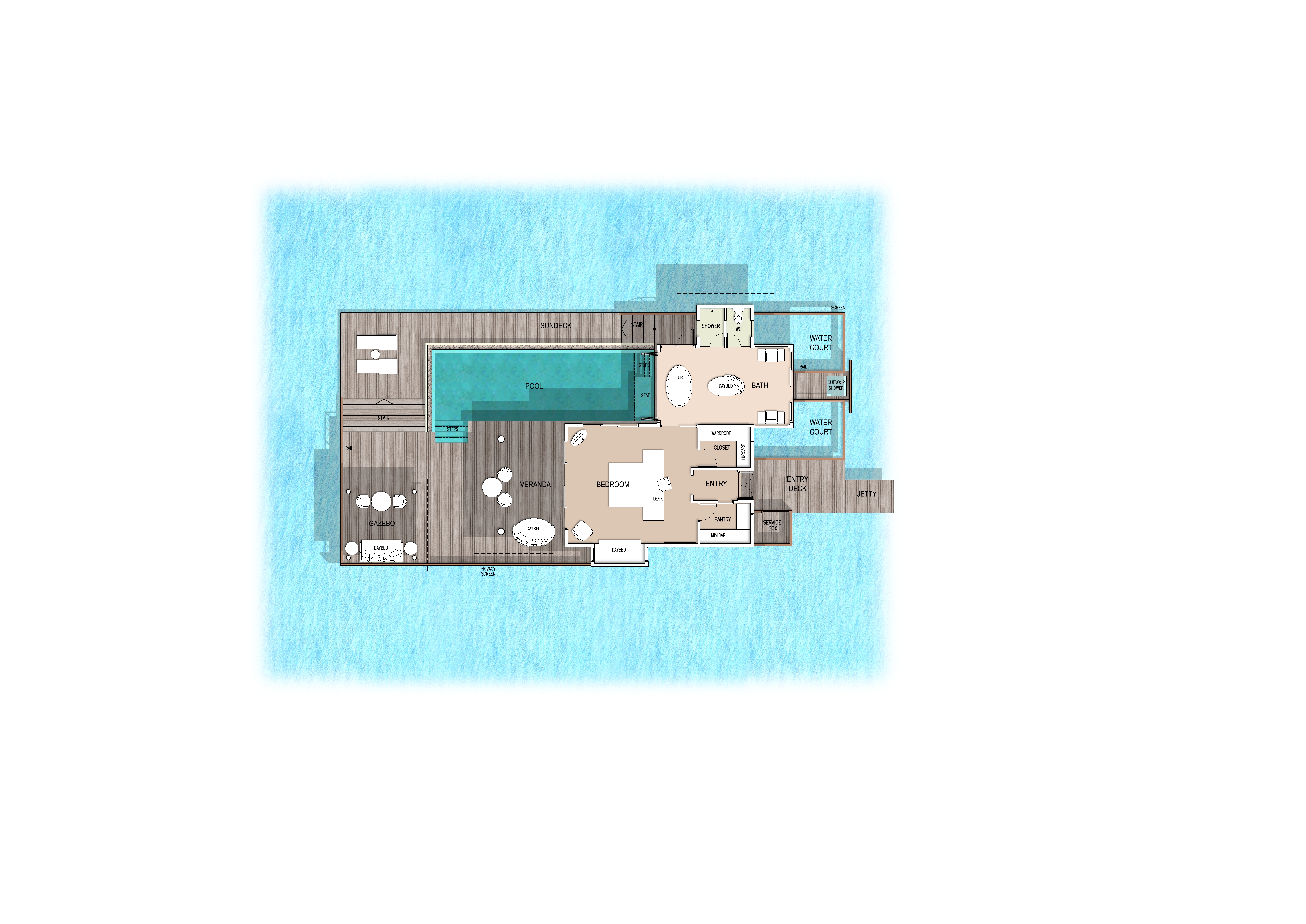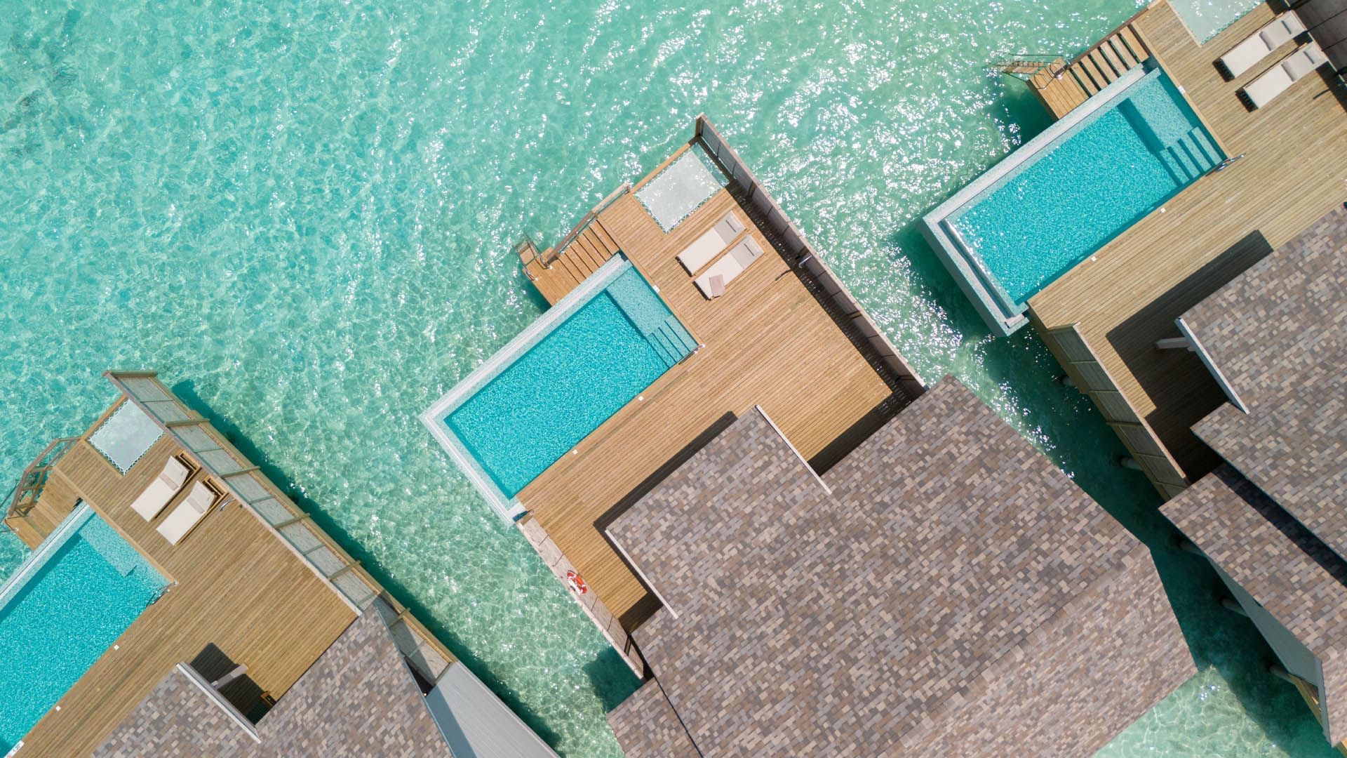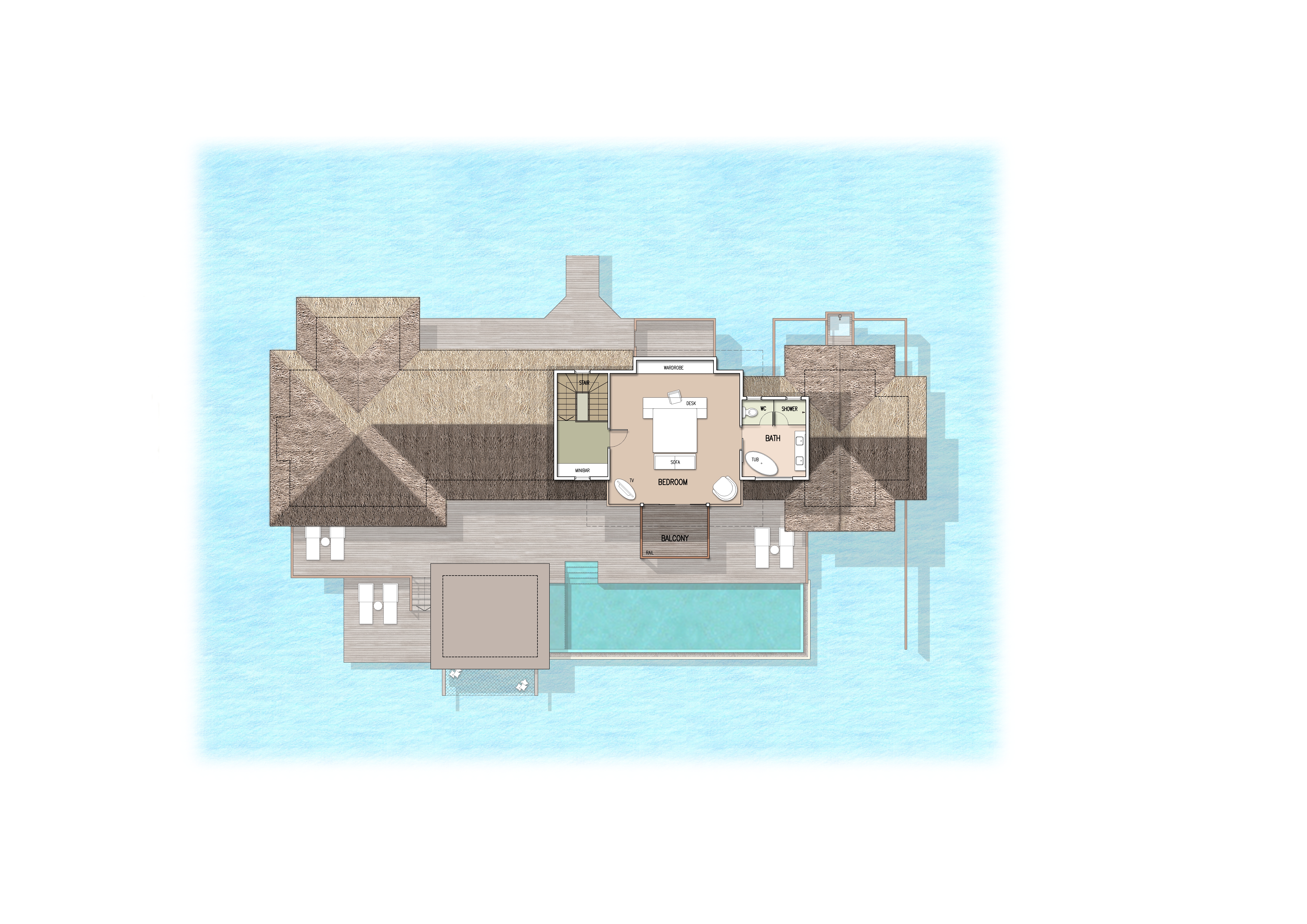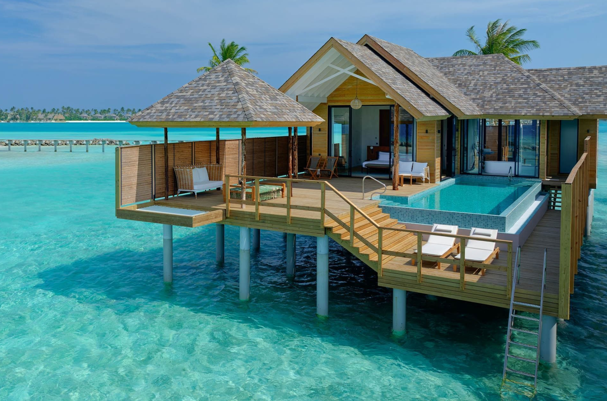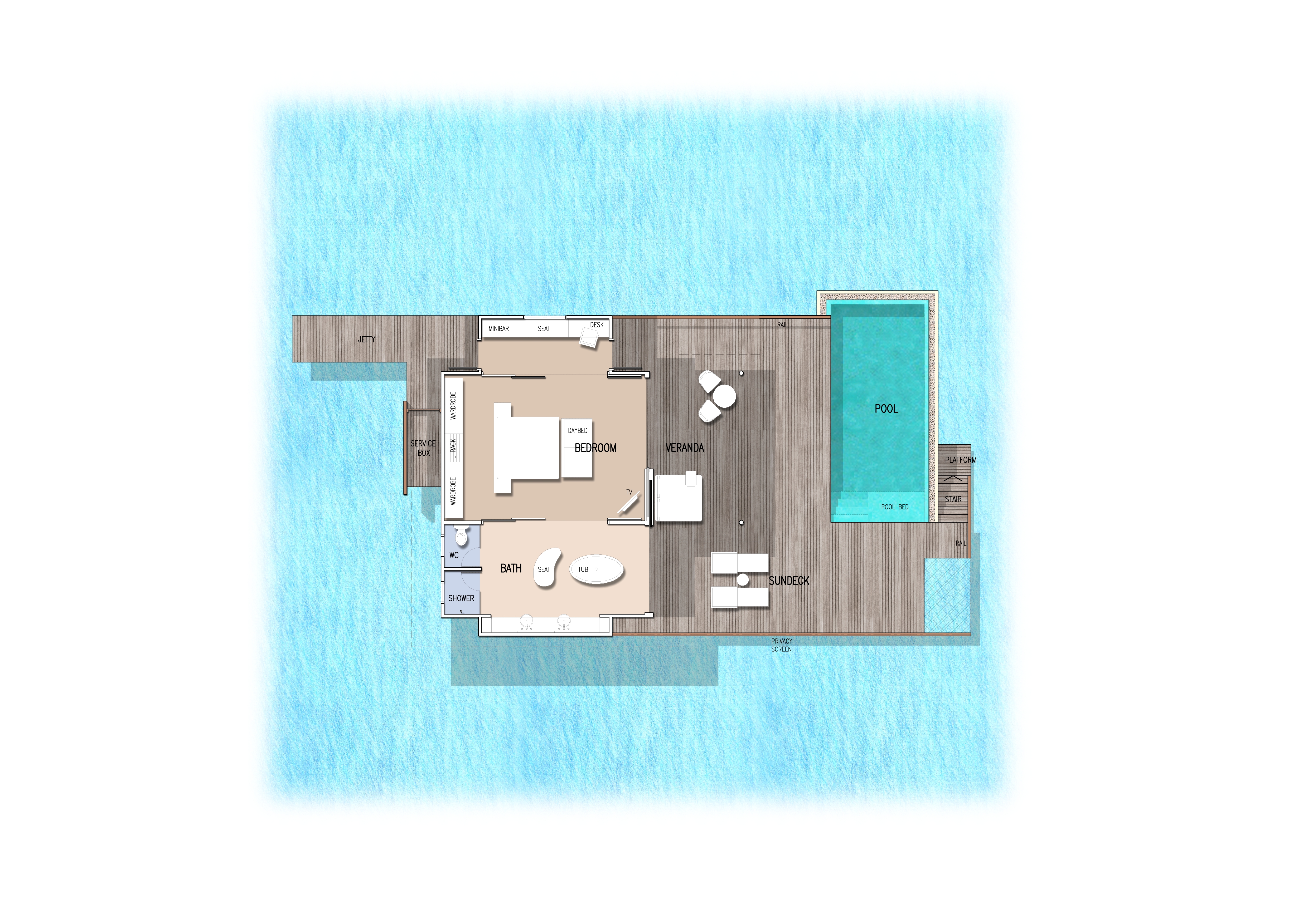 房型介绍:位于主岛,坐落于美丽的蓝色海水之上,这些梦幻般的隐秘居所拥有舒缓的白色内饰。配有豪华的特大床、海景浴室、以及带私人泳池、日光躺椅和直接通往珊瑚丰富泻湖的露台,提供无与伦比的放松体验。