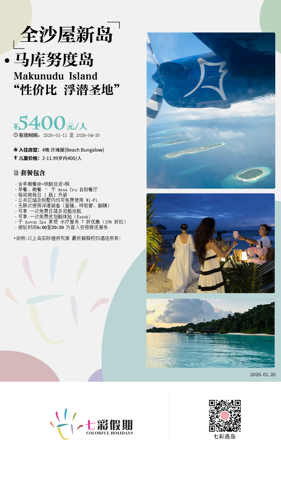 早餐07:30-10:00(自助餐) 午餐12:30-14:00(自助餐) 晚餐20:00-22:00(单点菜单、 周二马代特色烧烤、周五烧烤) |