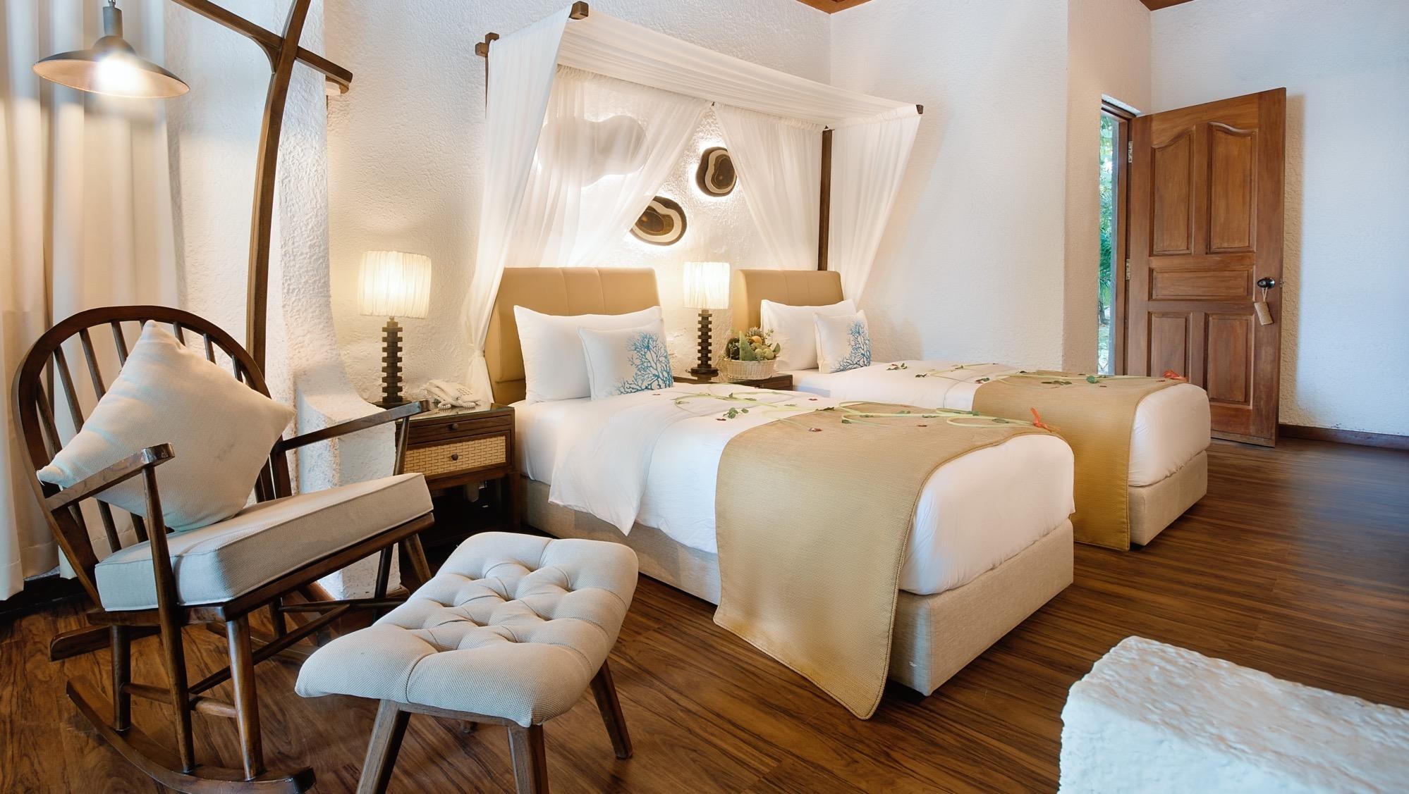 房型介绍:我们的16栋豪华海滩别墅体现了岛屿的热带魅力。在郁郁葱葱却低调的露天淋浴中享受,或在海浪摇篮曲中入睡。海滩就在你家门口,你可以在私人露台的遮阳篷下休息,欣赏海景。(额外福利包括每日下午直接送达别墅的小开胃小点,以及日落酒吧的免费日落饮品。)
